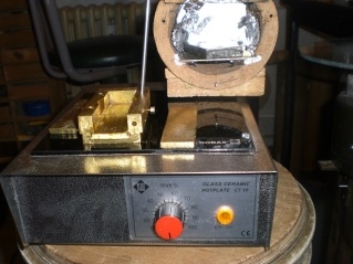 Auf den Messingplatten können Steinstücke, oder andere Objektträger vorgewärmt werden, oder mit kalten kann durch Unterschieben unter den zu heiß werdenden Klebeschrank die Temperatur gedrosselt oder gehalten werden.