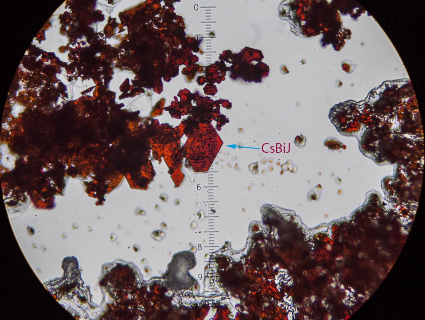 charakteristische Kristalle von CsBiJ4 (Caesiumtetrajodobismutat) zum Nachweis von Wismut (Bismut) neben anderen Schwermetallen, hier zum Beispiel im Mineral "Mixit".