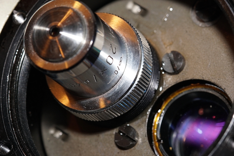 Für hohe Vergrösserungen können an diesem Gerät  Mikroskopobjektive eingesetzt werden. Empfohlen wurden z.B. Leitz NPL 10x /0,20 mit einem Arbeitsabstand von 17mm und Plan L25x/0,40 mit einem Arbeitsabstand von 11mm. Auch hier ist das Bild aufrecht und seitenrichtig.