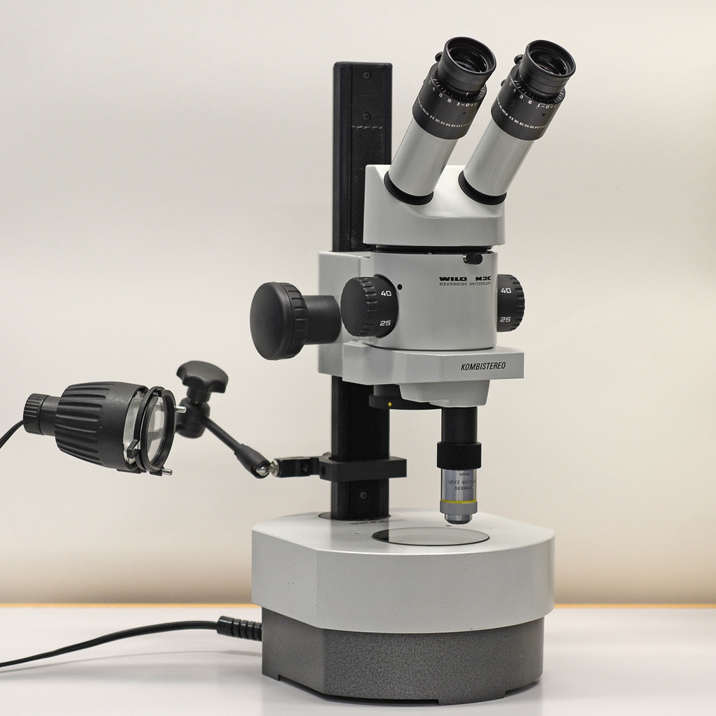 In der Grundausrüstung steht hier auf einem Durchlichtsockel ein Wild M3C mit den festen Vergrösserungen 6,4x, 10x, 16x, 25x und 40x mit den Weitwinkel-Brillenträgerokularen 10x/21B verzeichnungsfrei. Der Arbeitsabstand beträgt 89mm.