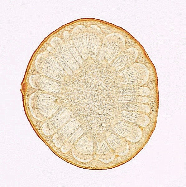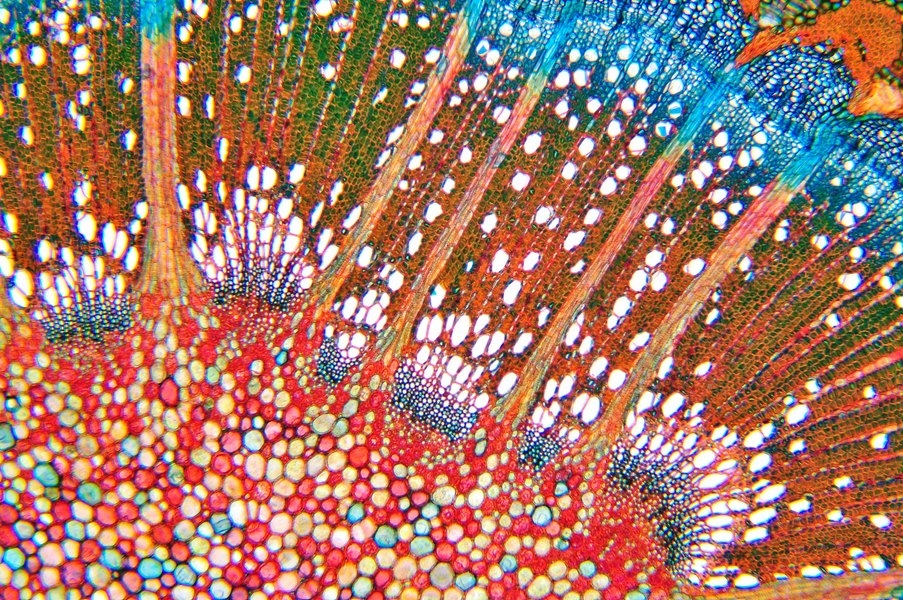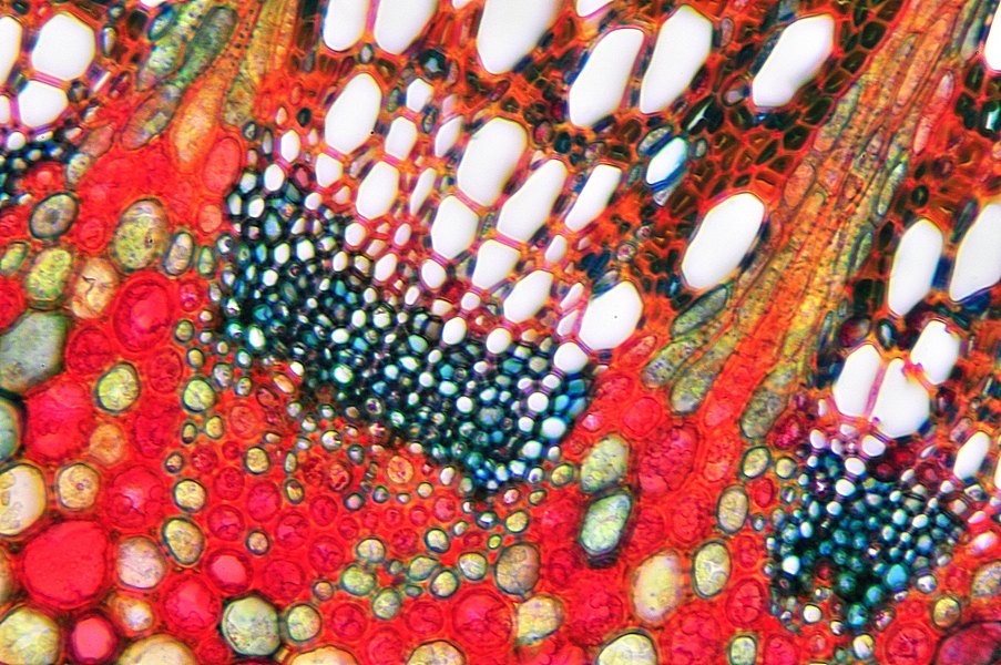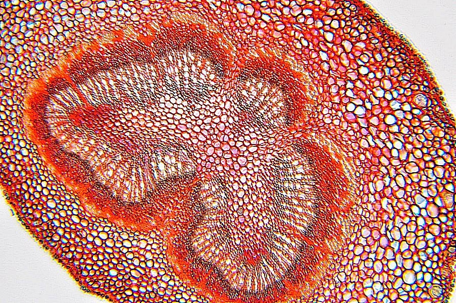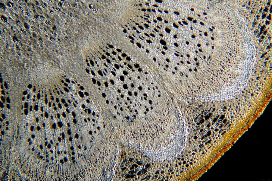 ZitatDer Zweig und die unterschiedlich starken Markstrahlen / Leitbündel. Ich denke, die Form ist zufällig und hängt mit der Bildung der Leitbündel während des primären Wachstums und deren Weiterentwicklung während der ersten Zeit des sekundären Dickenwachstums zusammen. Die einzelnen Leitbündelstränge, die beim ganz jungen Sproß noch durch Parenchymgewebe getrennt liegen, wachsen ja zum typischen Holzteil zusammen, in dem das umlaufende Cambium neue Zellen nach innen und außen bildet. Dabei dürften anfangs auch noch neue Leitbündel entstehen und es bilden sich dann die primären Markstrahlen mit ihren typischen Zellen heraus.