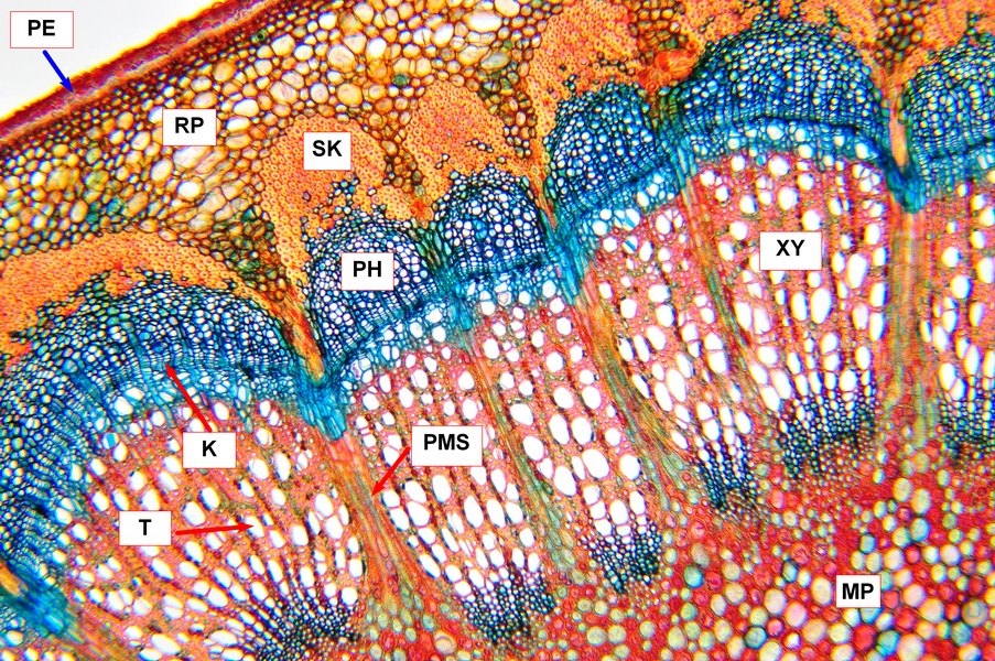 PE = Periderm, RP = Rindenparenchym, SK = Sklerenchym, PH = Phloem, K = Kambium, T = Trachee, PMS = primärer Markstrahl, XY = Xylem, MP = Markparenchym