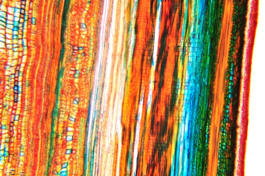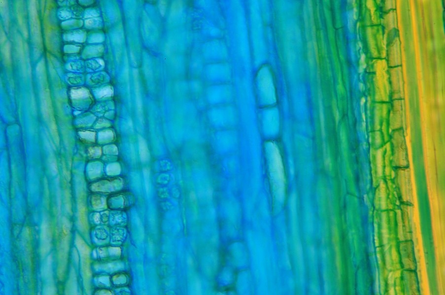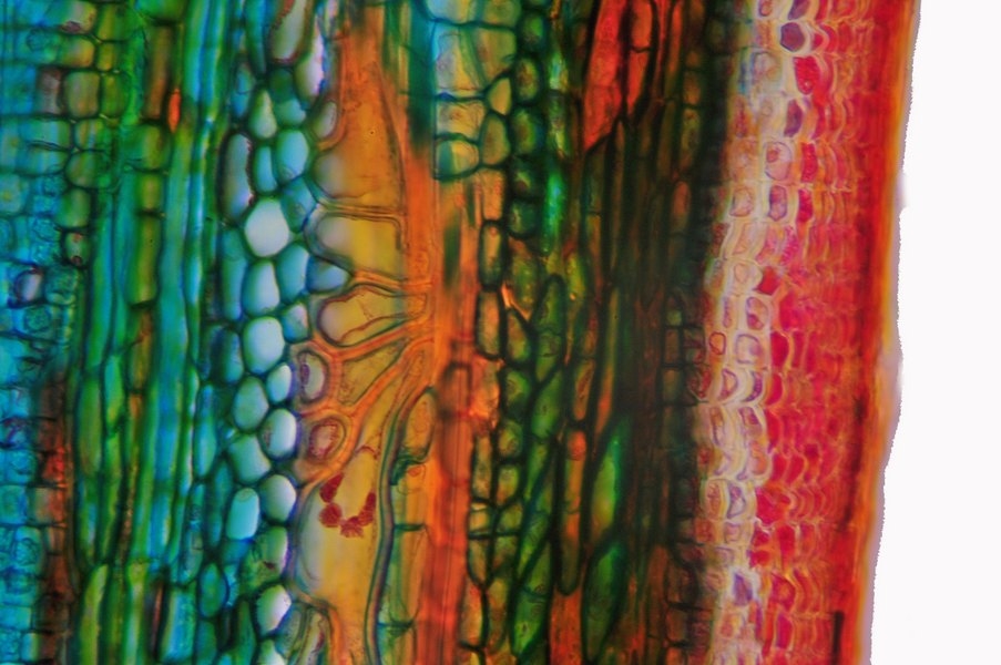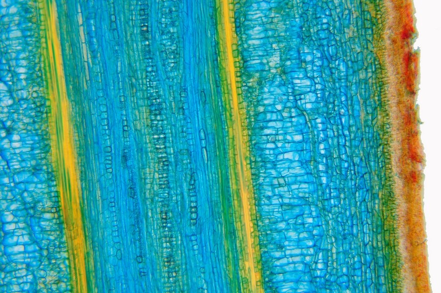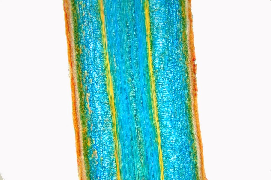 Zellwände blaugrün bis grün, verholzte Zellwände leuchtend rot, Zellwände der äußeren Hypodermis orangerot, Cuticula gelb, Zellwände der innenliegenden Hypodermis tiefrot.