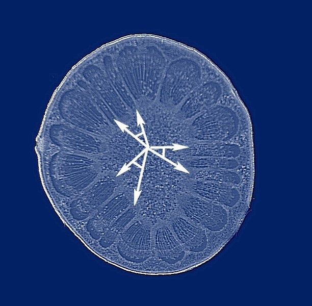 Der Zweig und die unterschiedlich starken Markstrahlen / Leitbündel. Ich denke, die Form ist zufällig und hängt mit der Bildung der Leitbündel während des primären Wachstums und deren Weiterentwicklung während der ersten Zeit des sekundären Dickenwachstums zusammen. Die einzelnen Leitbündelstränge, die beim ganz jungen Sproß noch durch Parenchymgewebe getrennt liegen, wachsen ja zum typischen Holzteil zusammen, in dem das umlaufende Cambium neue Zellen nach innen und außen bildet. Dabei dürften anfangs auch noch neue Leitbündel entstehen und es bilden sich dann die primären Markstrahlen mit ihren typischen Zellen heraus.