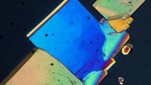 Zwischenzeitlich ward ich noch einmal auf das Fixiersalz fixiert, um im Kristallwasser-Schmelz-Präparat tatsächlich einen ,,willigen" (vermutlich weil er blau :D war) Klunker auszumachen, der gekreuzte Dispersion zeigt: