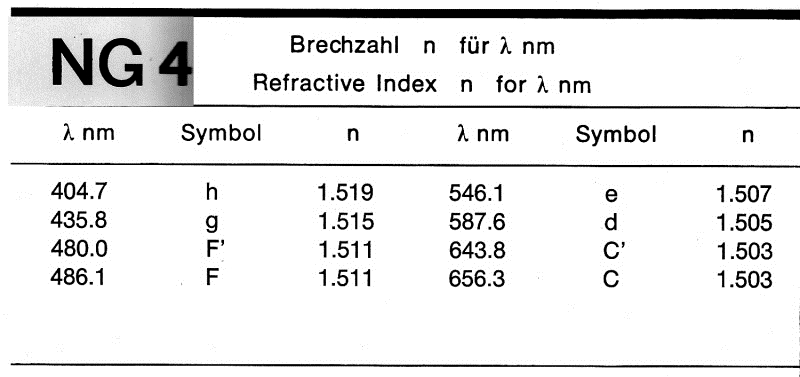 ich habe in meinem Bücherschrank aus der alten Zeit 1977 das Buch von H. Piller gefunden. Es wird langsam klarer. Als eine Referenz wird Schott NG 1 genannt. Ich könnte Dir ein Schott NG 4 geben, welches recht gut bei Schott beschrieben ist. Daraus kann man sehr schön die Reflexion errechen.