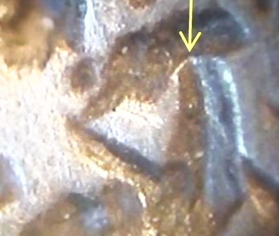 Bild 5. Der gelbe Pfeil markiert die Stelle an der dieses Gesichtsprofilmeingearbeitet ist. Diebildperipherie ist noch nicht zi0uordenbar, da die Historienthematik noch nicht erkannt ist. Dass es sich um ein Bild handelt ist daran zu erkennen, das die geographische Aufteileung der Bildareale nach Geometriemuster ueber die gesamte Bildflaeche identisch verlaeuft. Die Natur, der Zufall kann diesen Charkter nicht produzieren.