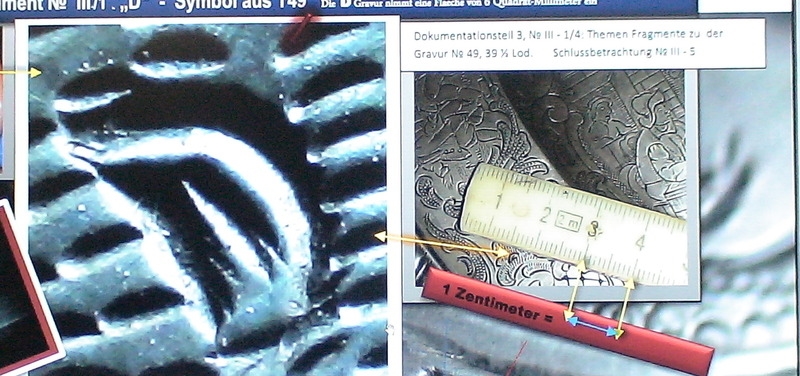 Es handelt sich um einen Silberteller, der mit einer aufwendigen Gravur einer biblischen Szene versehen ist und offenbar durch eine durchsichtige Lasur konserviert wurde. Schon die Analyse dieser Dravuren ist ein Kunstwerk mit mehreren 'Beziehungsebenen', deren Zusammenhang auch mir ziemlich logisch erscheint. Herr Haggenmüller hat sich in 8-jähriger Analyse mit diesen Gravuren und ihrer Interpretation beschäftigt.