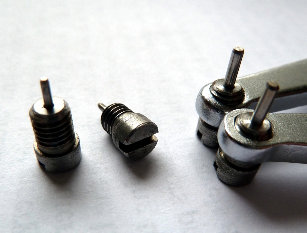 das sind doch ganz normale M 5 Schrauben. Ich habe normale Schrauben entsprechend gekürzt, aufgebohrt und harte Stifte mit Loctite eingesetzt. Die Stifte gibt's "für Pfennige" im Netz, und sie sind viel besser als die Original-Stifte, da sie nicht ganz so spröde sind. Das sieht dann so aus:
