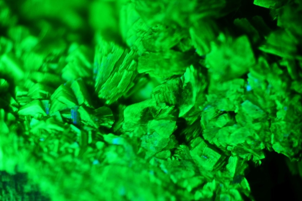 Leider bin ich fernab von meinen Mikroskopen im schönen Schwarzwald. Das Objekt wurde also eher im Makro- als im Mikrobereich frei Hand aufgenommen. Ursprünglich stammt das fragliche Objekt aus Portugal. Es wurde hier einmal mit LED-Licht und einmal mit einer starken Fluoreszenztaschenlampe aufgenommen. Und es bringt stolze 115 000 CPM auf die Waage.