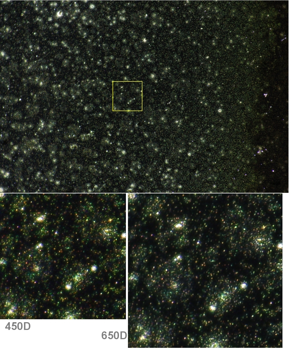 Mit einem Objektiv PlanApo 20/0,7 , Projektiv 1,67x und als Objekt ein versilbertes Deckglas mit vielen kleinen Fehlstellen wird der Vergleich angestellt.