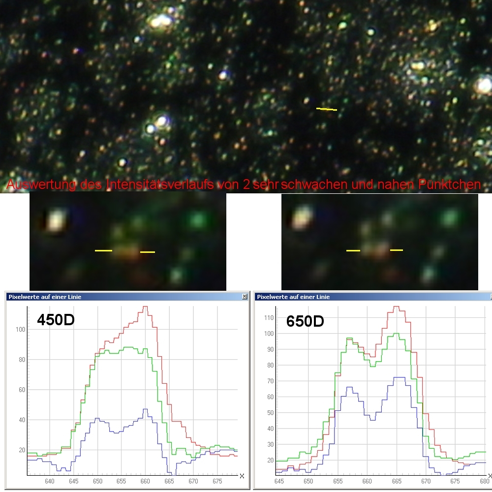 Schon hier ist ein Unterschied erkennbar. Jetzt die Auswertung eines Intensitätsverlaufs mit 2 benachbarten hellen Pünktchen.