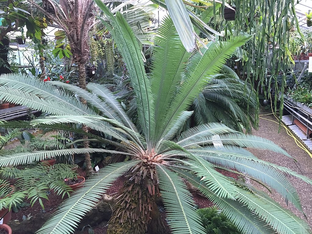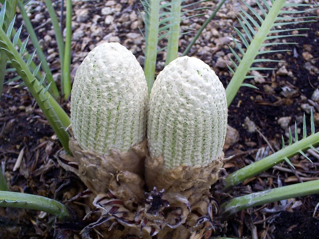 Cycas revoluta ist also die ursprünglichste Form, Dioon liegt dazwischen und die Gattung Encephalartos ist entwicklungsgeschichtlich die jüngste Form.