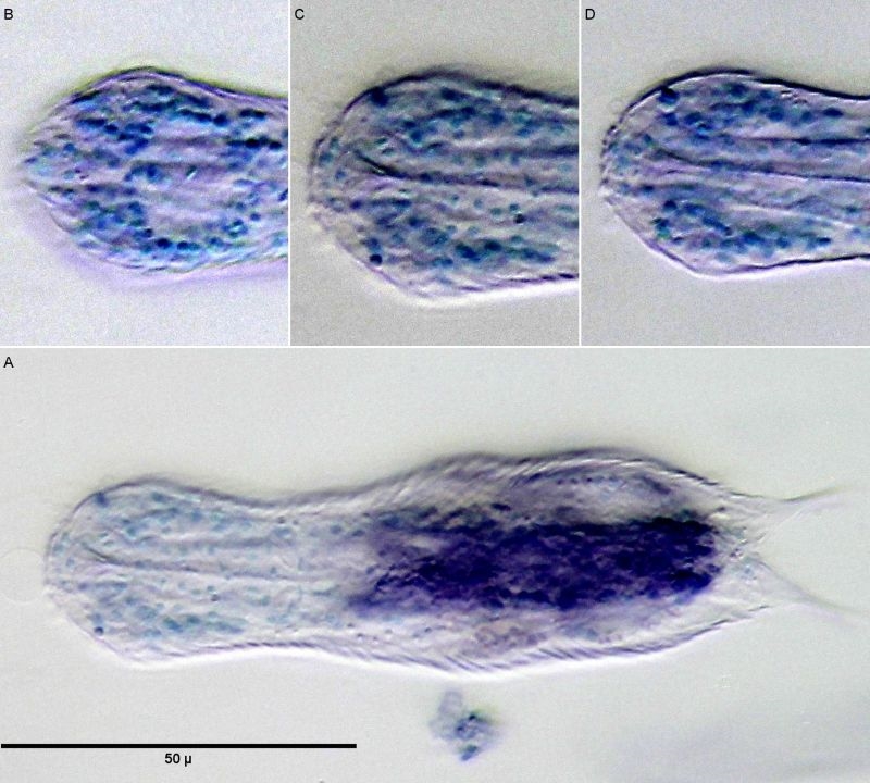 Bild 3: H. ocellatum macrops: gefärbt mit Methylgrün - A: Übersicht;  B-D: unterschiedliche Fokusebenen Dorsal -> Ventral - PL 40