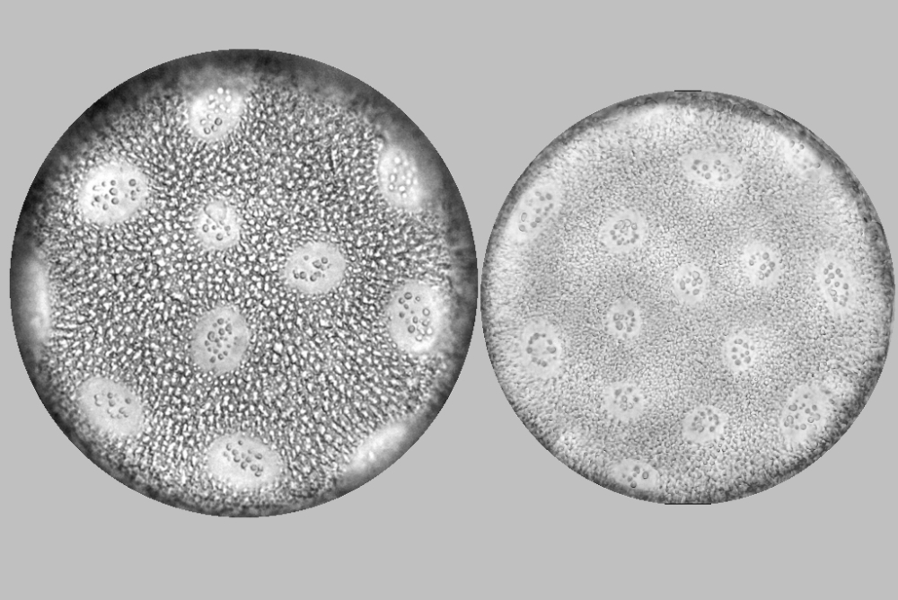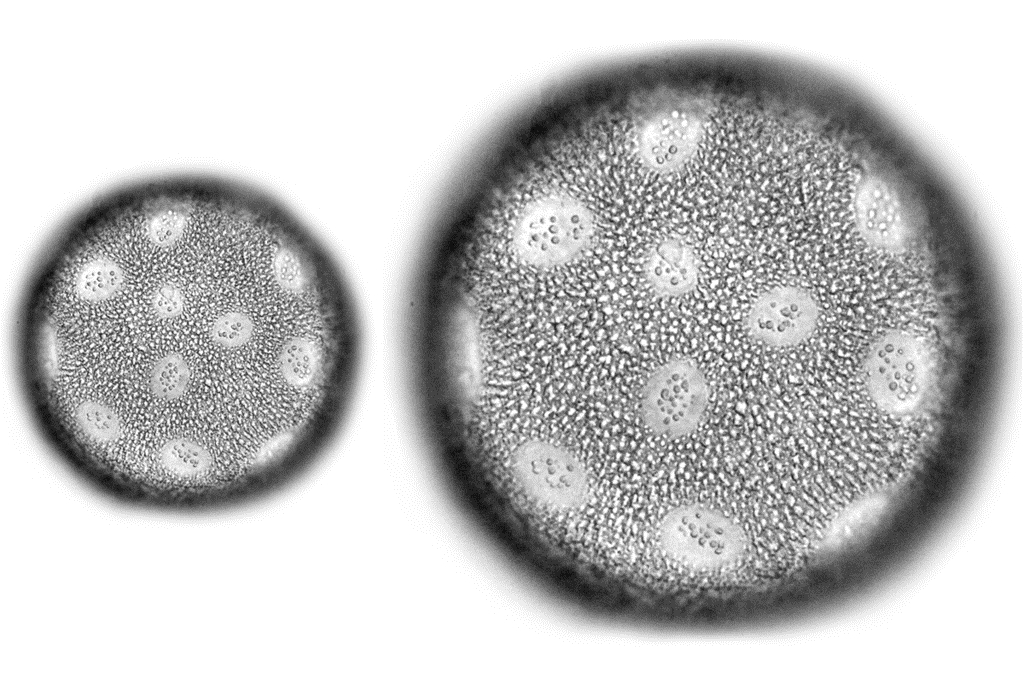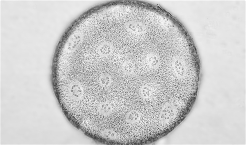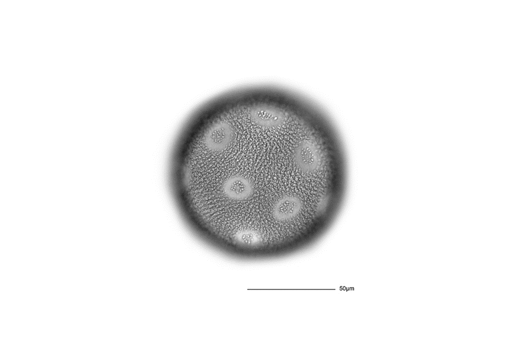 Ich möchte noch ein Bild zur Ergänzung zeigen, wo man die Verdünnungen in der Wand der Pollenkörner gut sehen kann. ZW 40er achromat, Hellfeld: