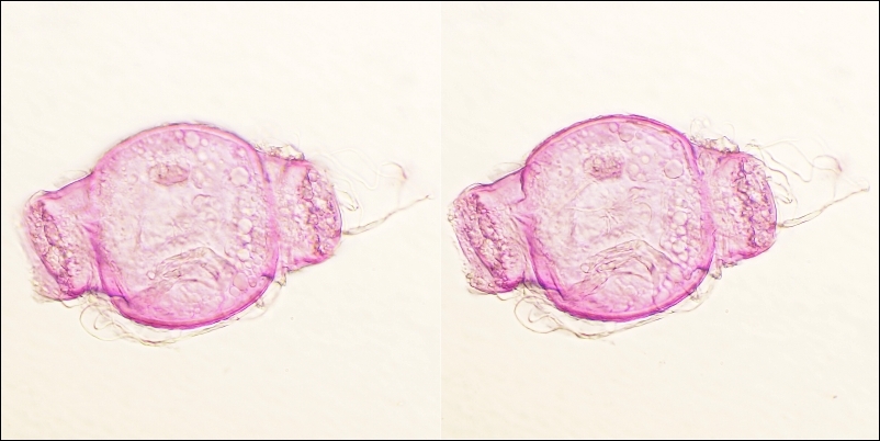 Das Pollenkorn stammt von einer Fuchsie, Fuchsia boliviana eventuell. Es wurde sehr vorsichtig mit Fuchsin gefärbt, eigentlich überflüssig (Erkenntnis im Nachhinein), da sich die Kontrastsituation nicht/kaum verbesserte.