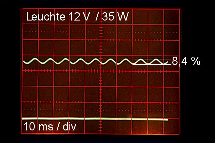 Damit kann gezeigt werden, dass die Intensität im 100 Hz Rhythmus variiert (nicht mit 50 Hz !), denn dem Glühfaden ist die Stromrichtung wurscht. Die Intensität schwankt um weniger als 10% . Zudem habe ich eine 12 V / 35 W und somit mit einem dünneren Faden genommen. Also wird eine 6 V / 30 W mit dickerem Faden etwas träger sein.