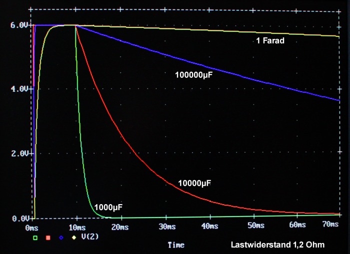 Simulationsrechnung für 4 unterschiedliche Kondensatoren , 1 000µF , 10 000µF , 100 000µF und 1 Farad !