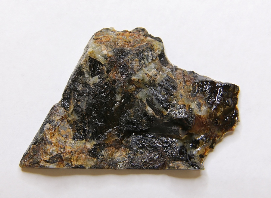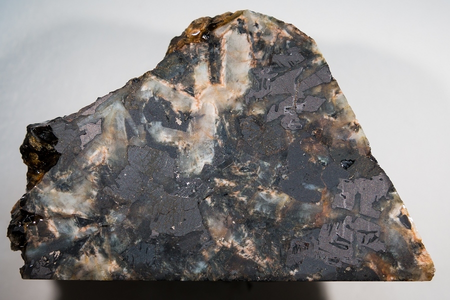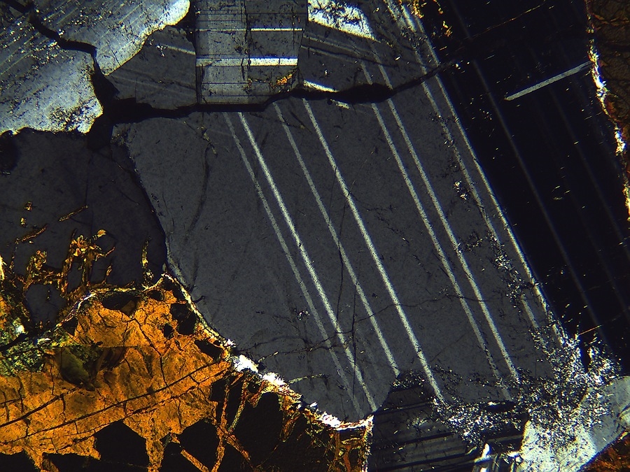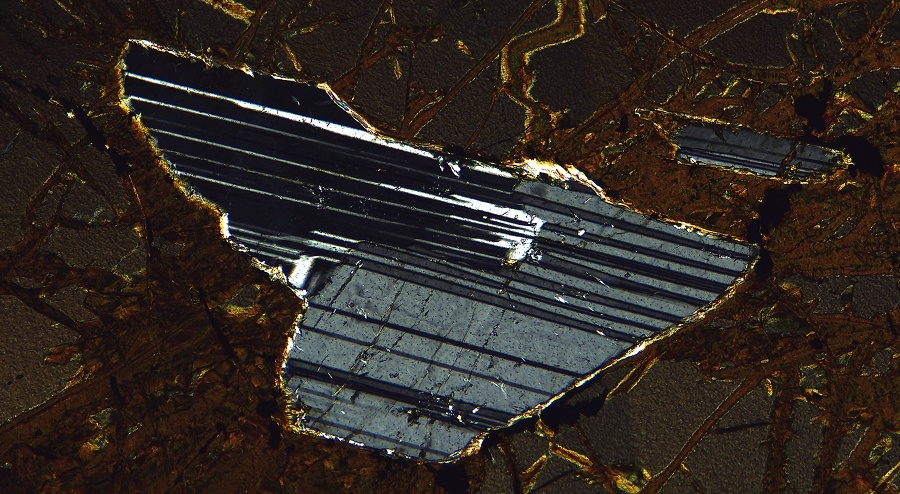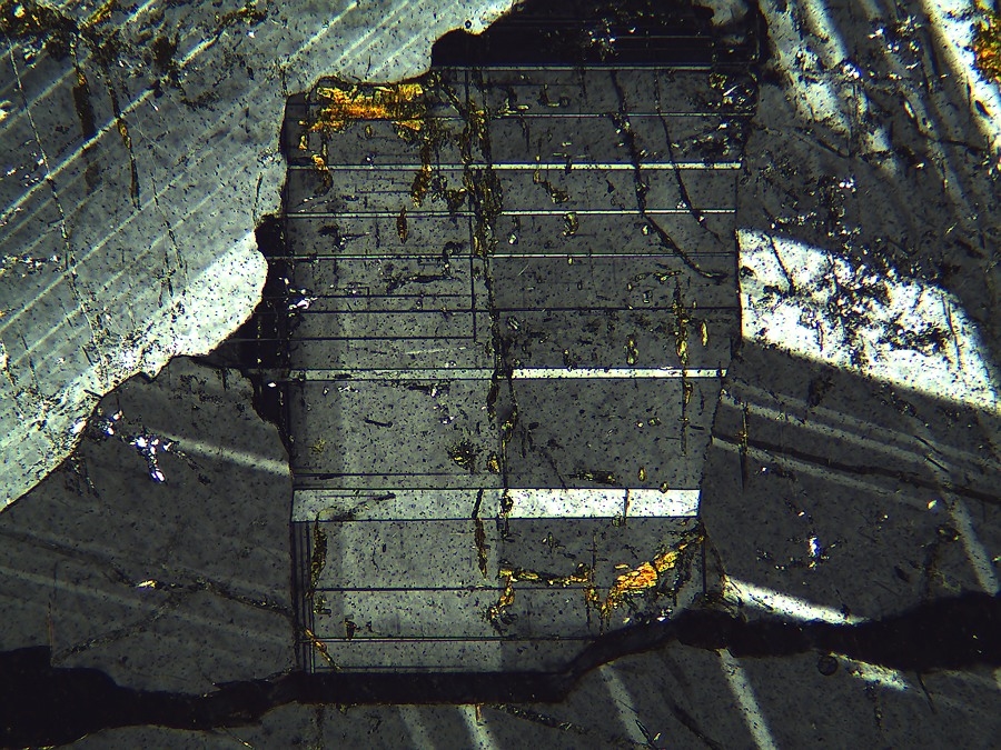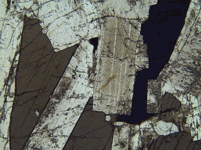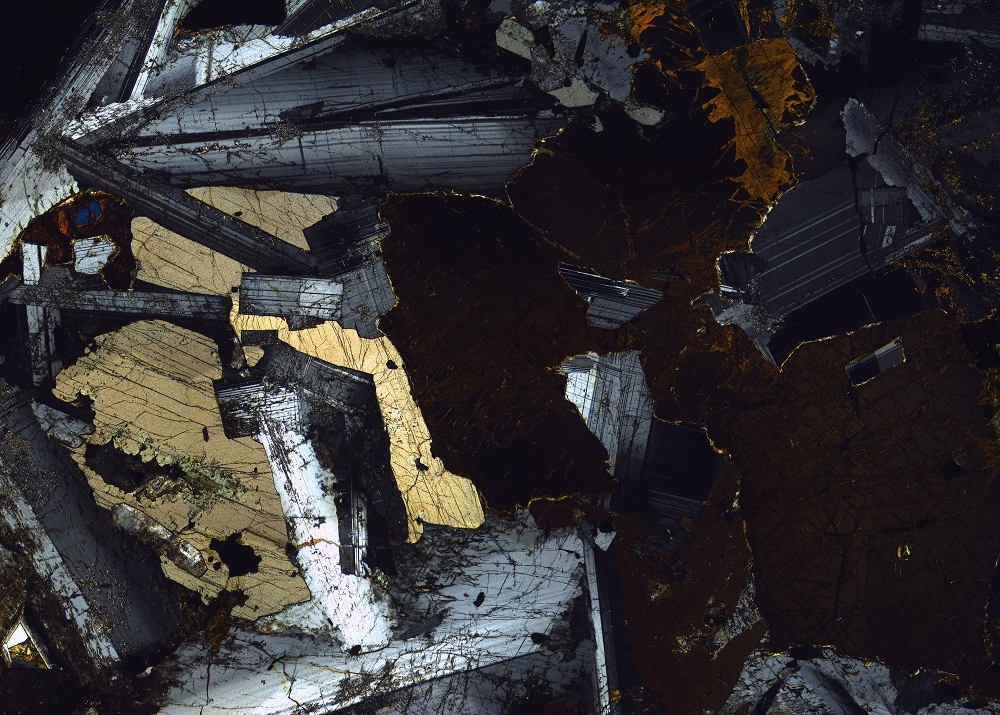 Jedenfalls handelt es sich um einen sehr grobkörnigen Gabbro mit vorwiegend Plagioklas (farblos durchsichtig mit nur einem Polarisator und lamellar verzwillingt bei gekreuzten Polarisatoren), Pyroxen (leicht gefärbt) und Magnetit (opak mit Skelettwachstum).