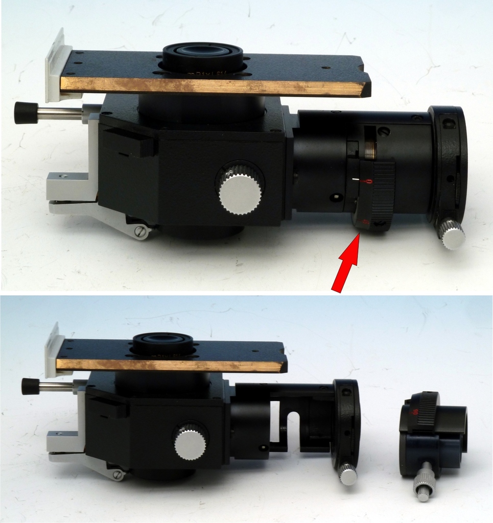 so sieht der richtige Pol-Opak aus, oben in zusammengebauter Form, unten  mit ausgebautem Prismenpolarisator. Das Prisma ist ein dreiteiliges Ahrens Calcit-Prisma und schweineteuer - ganz deutlich im 4-stelligen €-Bereich!!!
