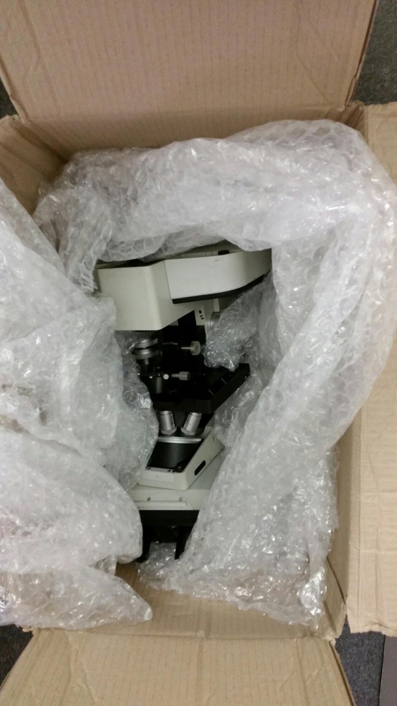 Ein in der Pre-Brexit-Zeit erworbenes Olympus Inversmikroskop (tolle Helligkeit und Riesenbarbeitungsraum) kam im klappernden Karton an.