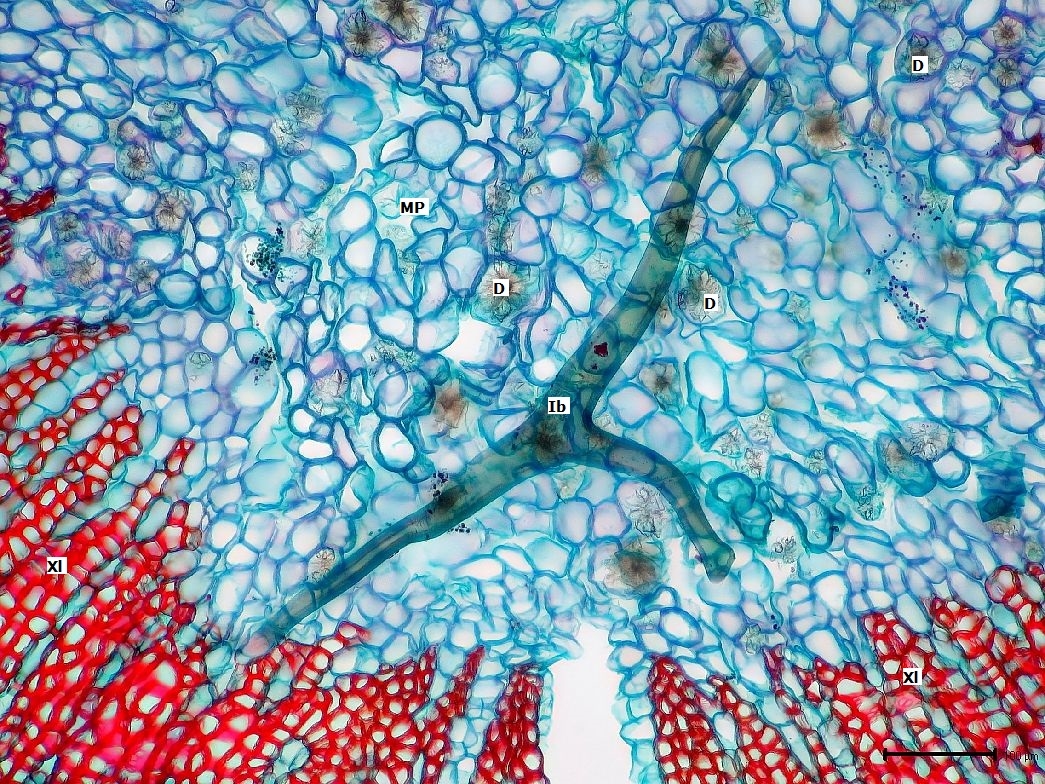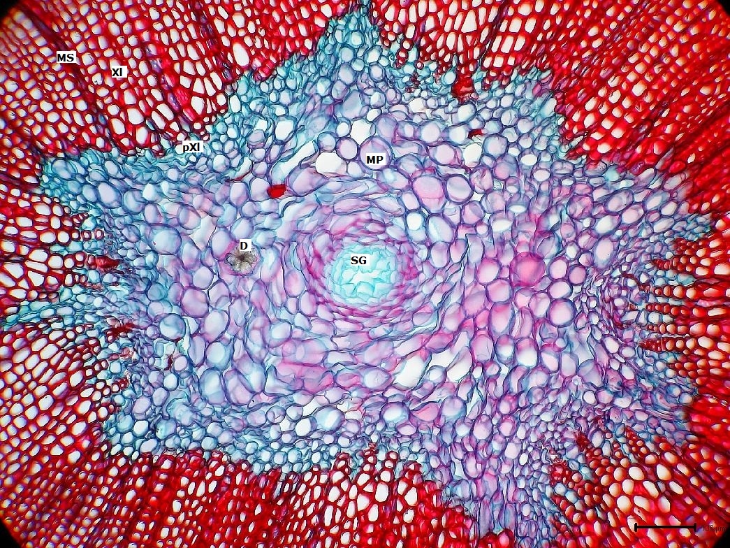 Mitten im Markparenchym sitzt ein Sekretgang und es gibt einige Drusen. Begrenzt wird das grob sternförmige Mark vom Protoxylem des Holzteils.
