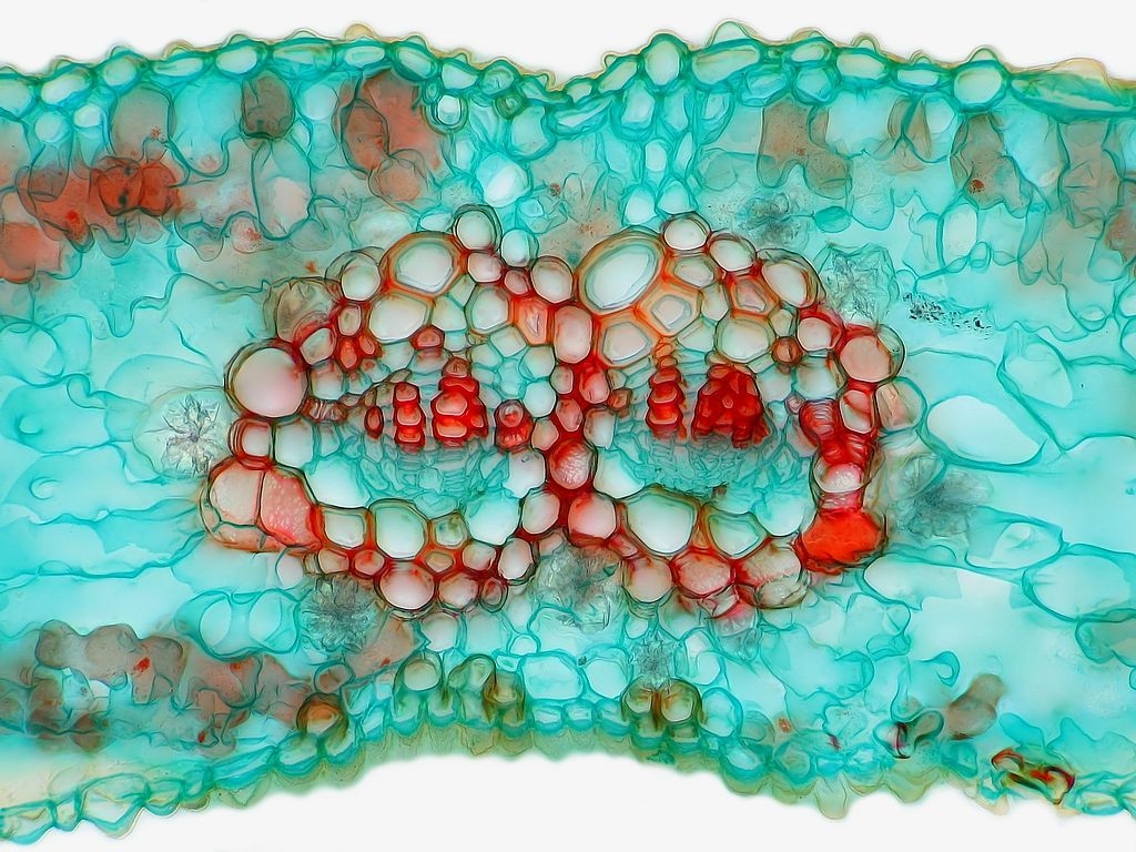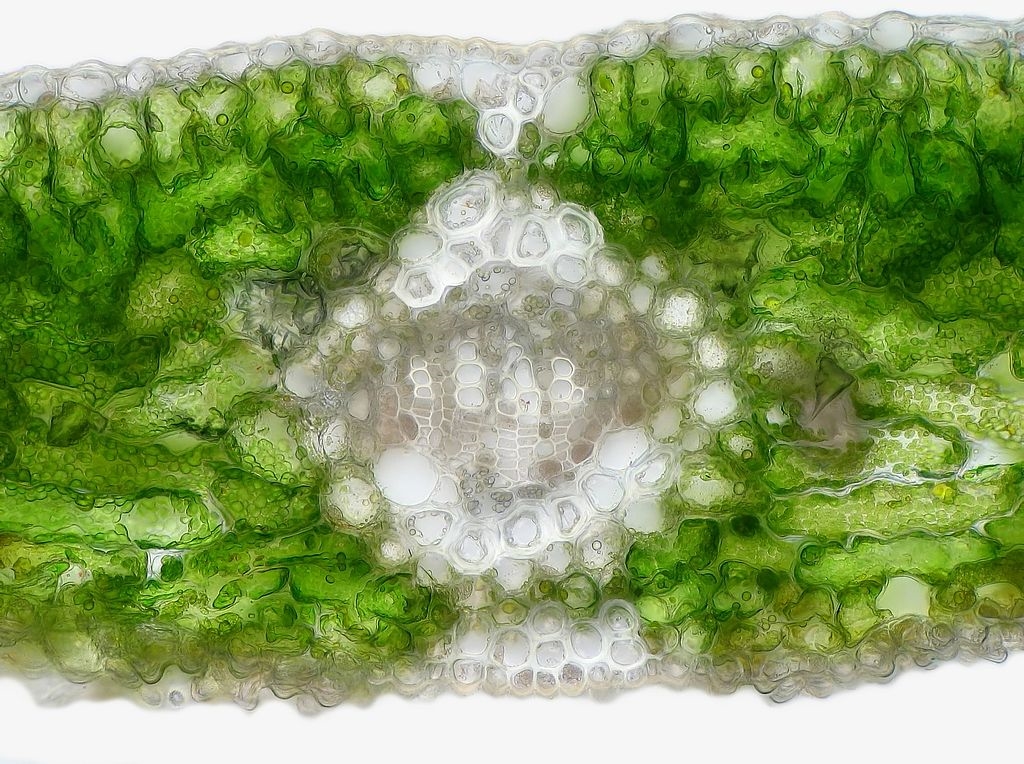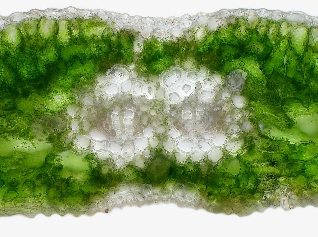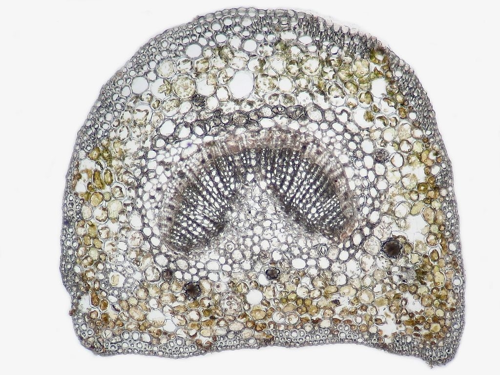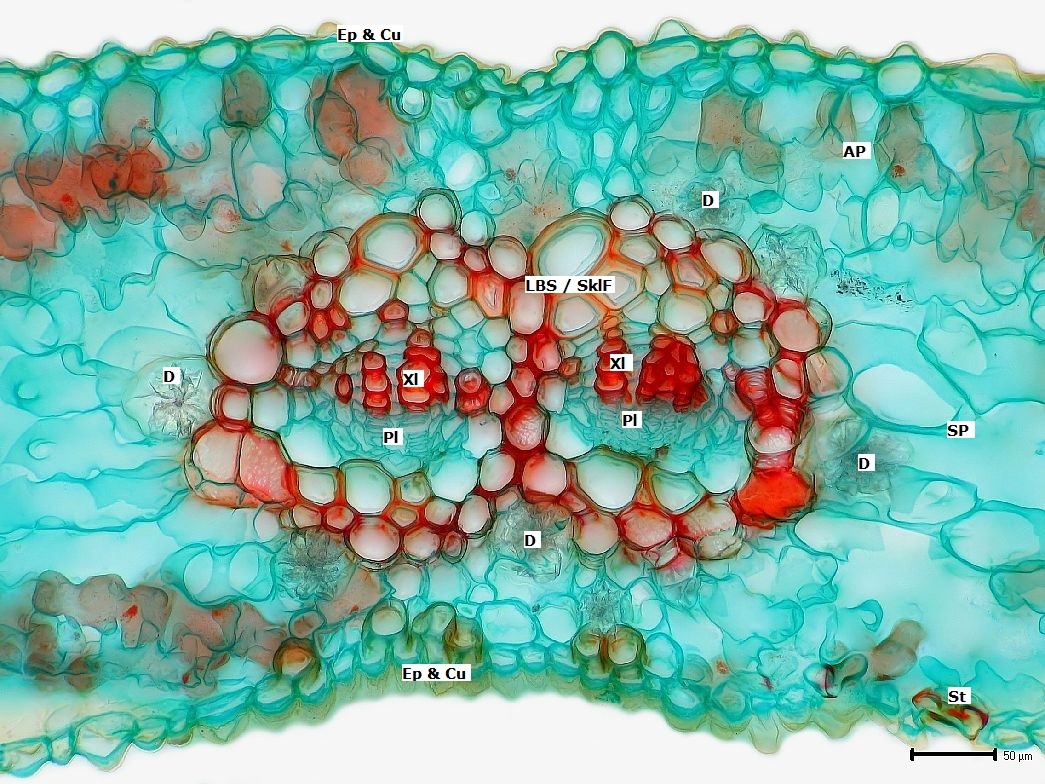 Zum Schluss nun die Blattspreite. Im Ginkgoblatt teilen sich die Leitbündel gabelförmig immer weiter auf, was sich auch mit dem bloßen Augen erkennen lässt. Somit finden sich auch in den Schnitten entsprechende Gabelungen.