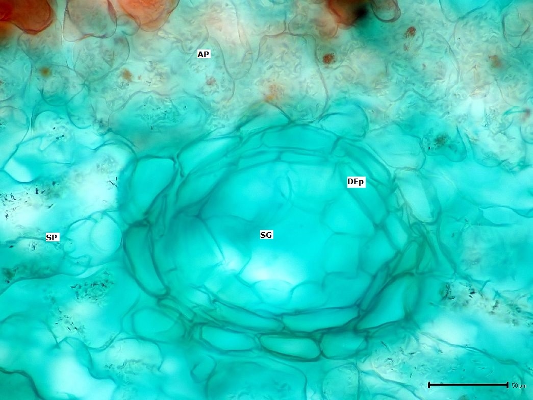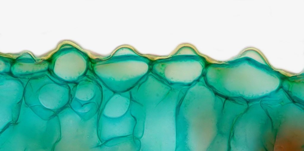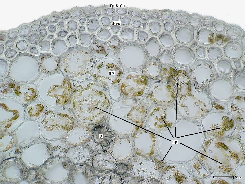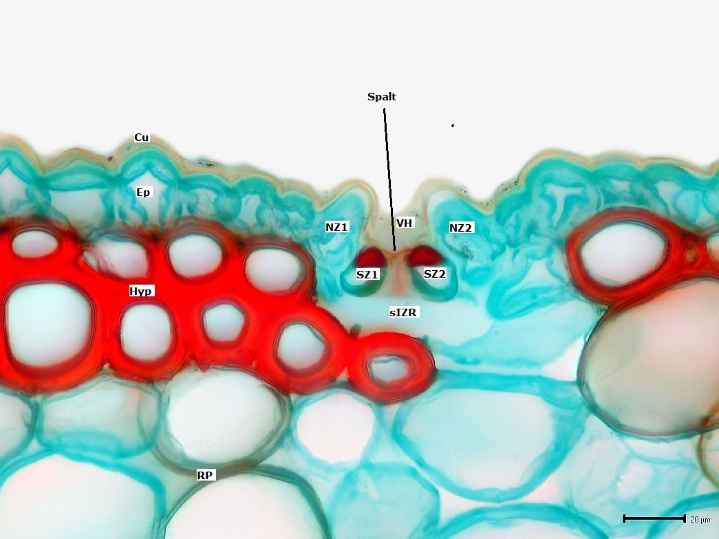 Auf der einreihigen Epidermis sitzt eine ca. 2 µm dicke Cuticula.
