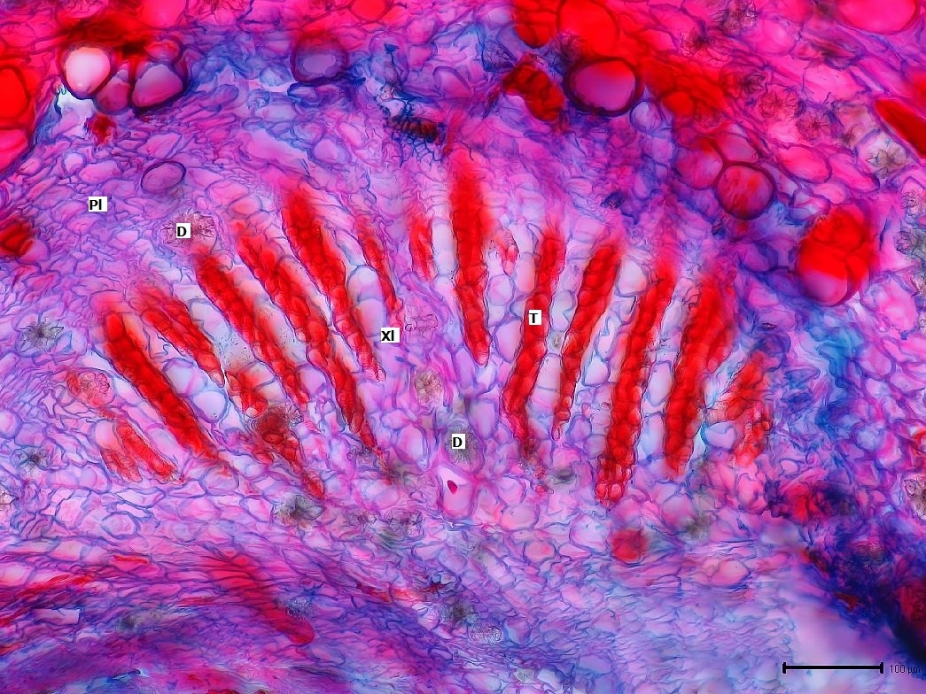 Die Blattspur ist sehr schräg angeschnitten, daher überlagern sich die Tracheidenzellen zu roten Bändern.