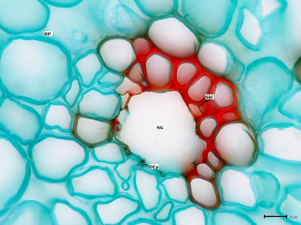 Der Sekretgang zeigt den gleichen Aufbau wie im Spross, ist hier jedoch nur teilweise von sklerifizierten Zellen umgeben.