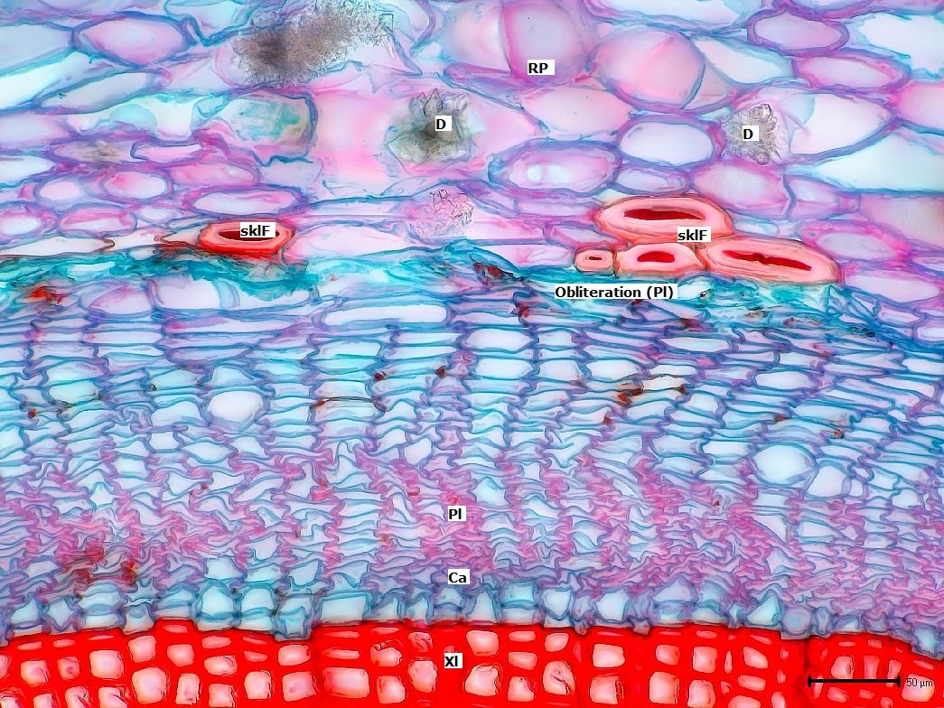 Auf dem Xylem, im Bild unten, liegt das Cambium auf, gefolgt vom Phloem, dessen Zellen durch die Präparation etwas zusammen geschoben sind. Am äußeren Rand des Phloems finden wir zerdrückte Zellen, die nicht mehr in Funktion sind 8Obliteration). Daran schließt sich das Rindenparenchym an, das auch nach zwei Jahren sekundären Wachstums noch vorhanden ist. Dort finden wir Sklerenchymfasern, Drusen und einige Sekretgänge, die wir im folgenden genauer anschauen.