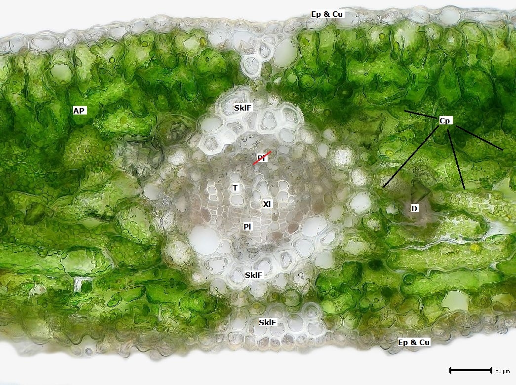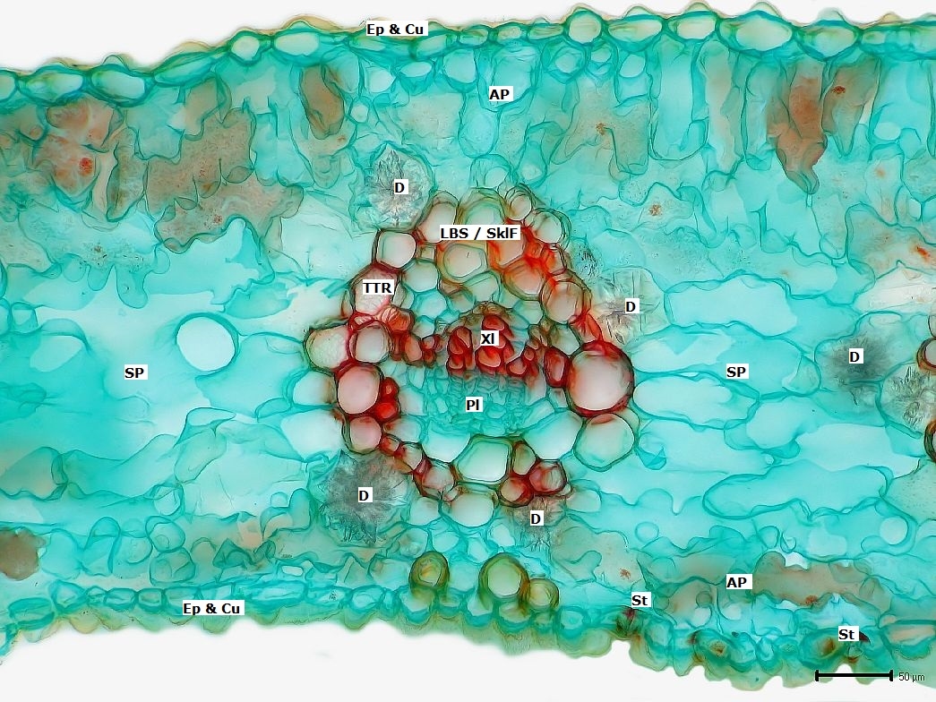 Eingebettet in ein dichtzelliges Assimilationsparenchym, das in der Blattmitte von einem nur wenig lockereren Schwammparenchym unterbrochen wird, liegt ein Leitbündel in seiner auch hier vorhandenen Leitbündelscheide. Die von Transfusionstracheiden gebildet bzw. unterbrochen wird. Im Mesophyll wieder viele Calciumoxalat-Drusen.