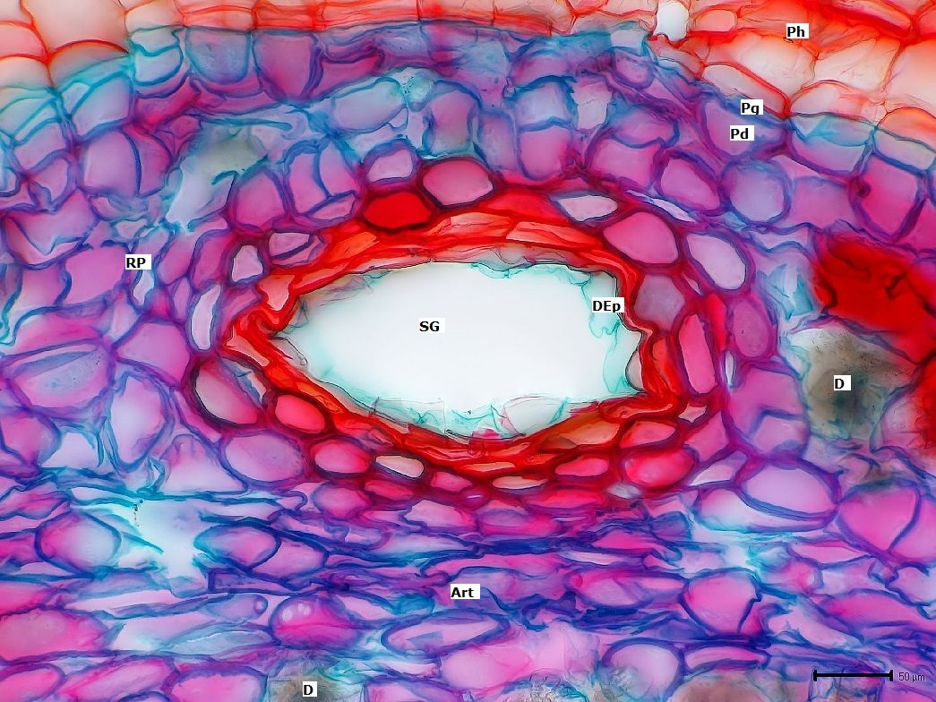 Der Gang ist schräg getroffen und sieht daher so aus, als ob er unten geschlossen wäre. Der Aufbau ist der gleiche wie bei den Sekretgängen des Sprosses und des Blattstiels, nur ist der äußere Zellring hier nicht sklerifiziert.