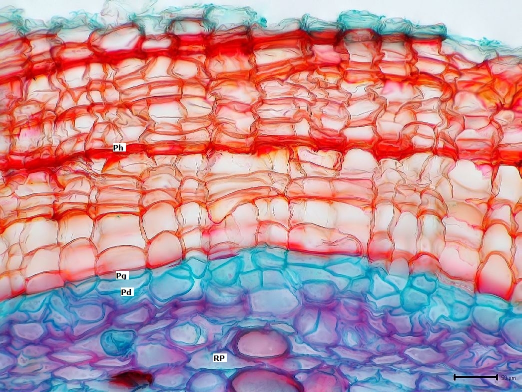 Unter der einreihigen Epidermis mit ihrer Cuticula liegt eine bis zu drei Reihen Zellen zählende sklerifizierte Hypodermis. Die Epidermis wird von einigen Stomata unterbrochen.