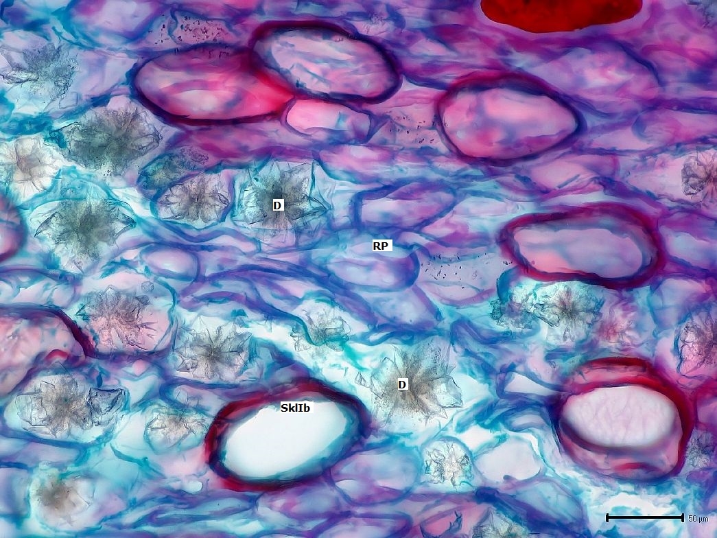 Im Rindenparenchym des Kurztriebs finden wir sehr viele Calciumoxalat-Drusen und die eingelagerten Sklerenchymfaser-Idioblasten.