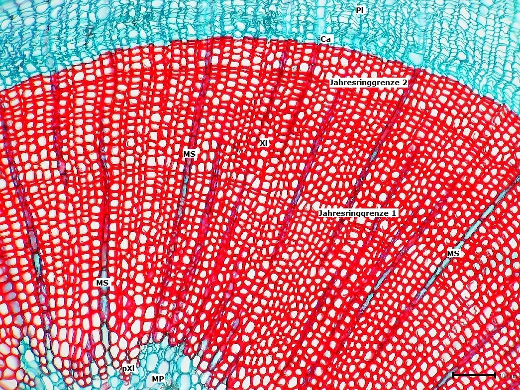 Das Xylem zeigt den auch für die Pinatea typischen Aufbau aus Tracheiden und wird regelmäßig von Markstrahlen unterbrochen. Auch die Jahresringe sind erkennbar: der Ast ist drei Jahre alt.