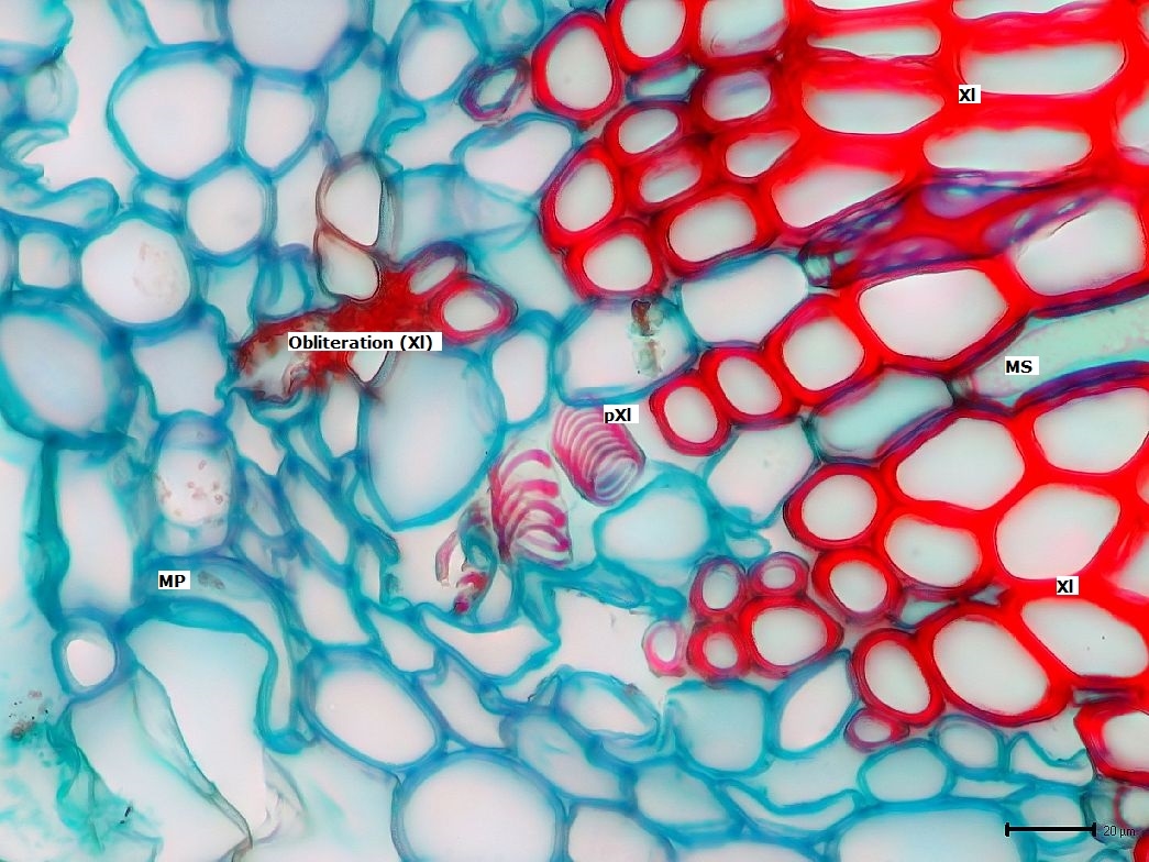 Wir sehen das primäre Xylem, das ein Stück ins Markparenchym hinein ragt, gefolgt vom regulären Xylem, dem Holzteil des Triebes. Die lose im Gewebe liegenden Spiralverstärkungen der Tracheiden lassen vermuten, dass diese nicht mehr funktional sind (Obliteration).