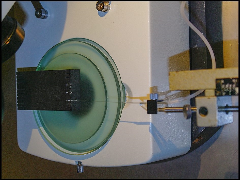 Die Arbeitsbasis ist auch für mich dabei die Kombination aus Mikroskop und Manipulator(en), ohne die das Einführen der Mikrometer- dicken Pipettenspitzen in die Kapillargefäße unmöglich wäre.