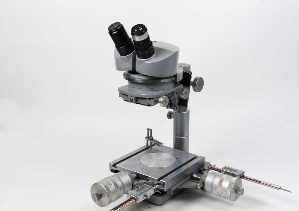 Dies benötige ich zum Vermessen mit Kreuzstrichplatte (in einem Okular verbaut) in Verbindung mit dem ganz oben zu sehendem Kreuztisch mit Mikrometerschrauben und digitaler Schublehre.
