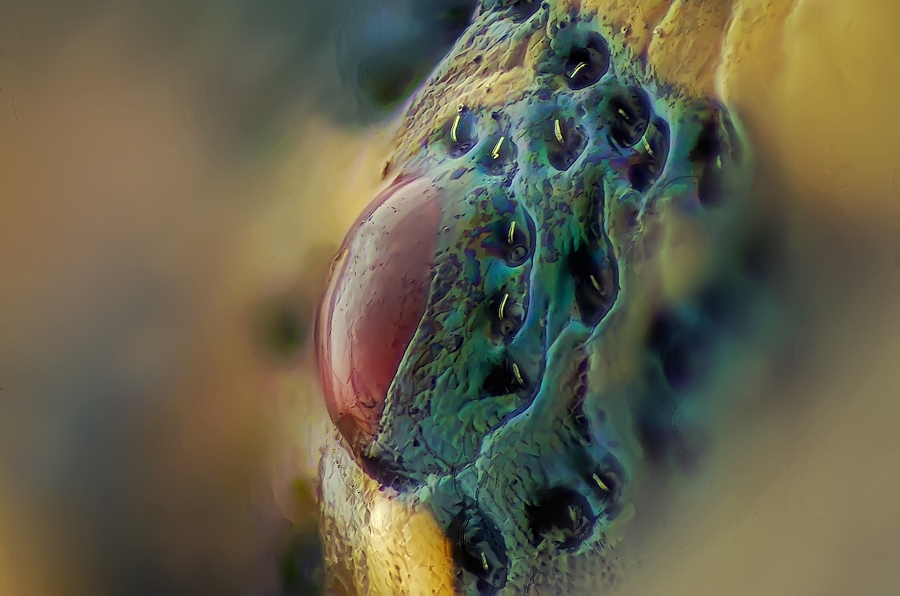 PS: die Herausforderung bei der Beleuchtung sieht man aber am fertigen Bild, da wurde ich im Unterrichtsfach "technische Fotografie" scheinbar sensibilisiert. Ich versuche ja selbst gerade verzweifelt meine Beleuchtungstechnik in diesem Bereich zu optimieren. Bei größeren Objekten im Studio nimmt man einen Diffuser in Halbkugelform und hat ein Loch das so klein ist wie die Makroobjektiv-Frontöffnung. In Relation zum Objekt ist das sehr klein und da liegt das Problem bei diesen Vergrößerungen ==> das Mikroskopobjektiv ist größer wie das zu fotografierende Objekt und man kann dem nur entgegenwirken wenn man mehr WD hat oder durch das Objektiv zusätzlich Licht schickt ...