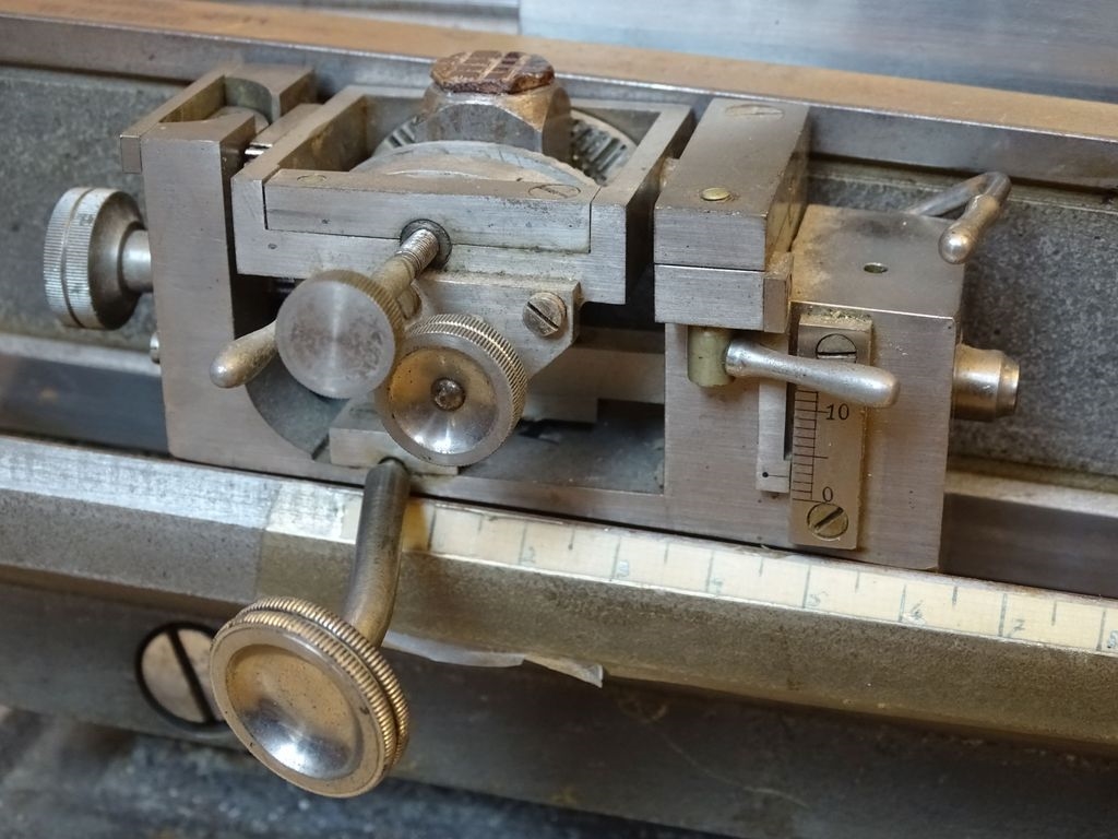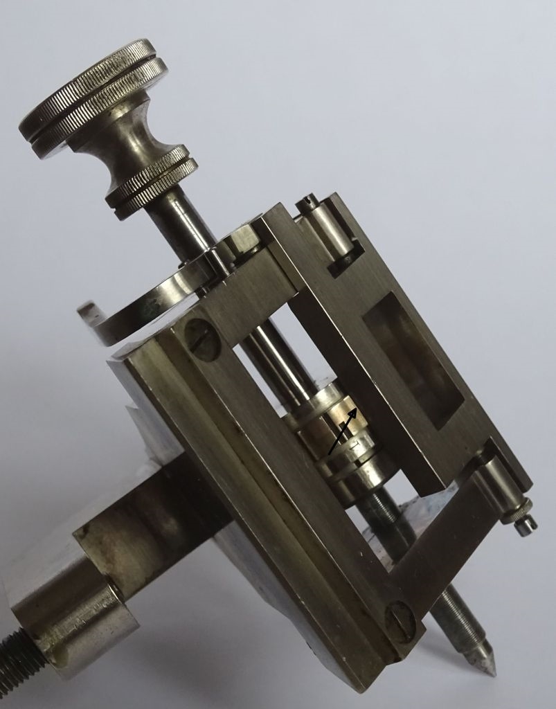 Weder der Objekthalter noch der Messerschlitten laufen auf Elfenbein, dafür sind an den Kontaktpunkten in die Messinggrundkörper kleine Bronzezylinder eingesetzt. Bei dem Objekthalter wurden die Kontaktpunkt zusätzlich noch leicht erhaben ausgeführt, um die Reibung zu vermindern (Bild 10).