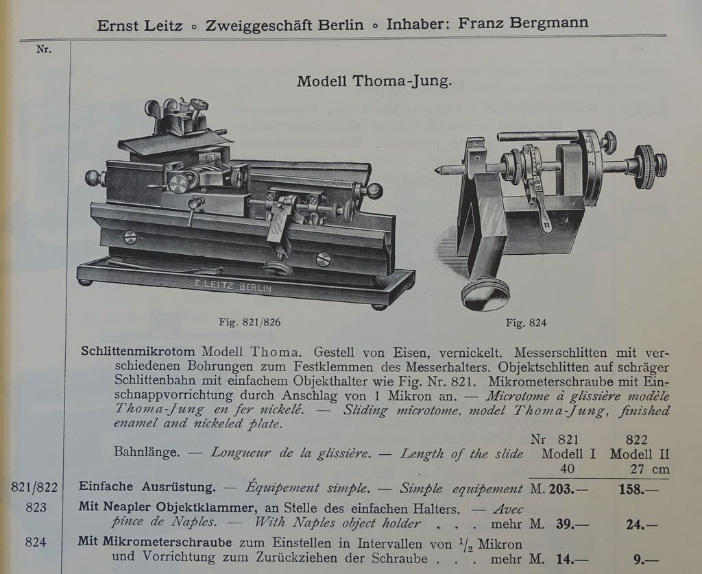PS: Nach dem "Preis-Verzeichnis der Instrumente & Apparate von R. Jung, Mechaniker & Optiker in Heidelberg" handelt es sich bei o.g. Mikrotom um das "Schlittenmicrotom No. II, ausgestattet nach den Angaben der zoolog. Station in Neapel" und hat um 1893 die Summe von 221.- Goldmark gekostet.