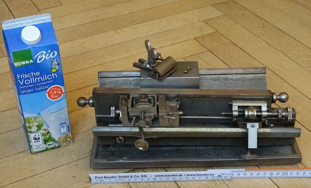 Zum Beispiel das vorletzte Foto von dem leider verbogenen Stellknopf der Höhenverstellung des Objekthalters. Um in der aufschiebbaren Hohlachse des Stellknopfs einen Eingriff auszubilden, wurde aus der Achse eine Prismenführung ausgefräst und anschließen ein kleines Prisma wieder eingelötet. Sichtbar wird das Ganze nur weil das eingesetzte Prisma aus Eisen statt aus Messing ist und deshalb etwas Rost angesetzt hat. Für mich als ehemaligen Werkzeugmacher ist diese Liebe zum Detail schon faszinierend. Auf dem Rändelrad wurde übrigens eine 5 eingeschlagen, die vermutlich für die Nummer innerhalb der Fertigungsserie steht. Der Wahrscheinlichkeit nach wurden immer 10 Stück als Kleinserie gefertigt. Die nachfolgenden Fotos zeigen das noch unrestaurierte Gerät (zum Größenvergleich eine 1 L Packung Milch).