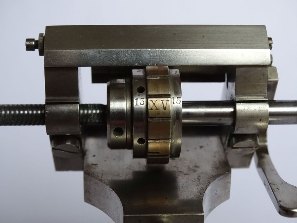 manchmal muss man sich nur die Mühe machen die Teile etwas genauer anzusehen und schon erklärt sich das Rätsel um die beiden Messingwalzen wie von selbst. Ich hatte auf Bild 5 schon den Stift aus dem Grundkörper des Vorschubes in die Walze gesteckt. Da schien er mir zumindest hinzugehören. Hält man mit dem Stift die eine Walze auf Position und dreht am Vorschub, so verdrehen sich die beiden Messingwalzen mit den Rastungen zueinander. Auf dem zurückgesetzten Rand der Walzen findet man jeweils neben einer Kerbe die arabischen Zahlen 1, 2, 5 und 15 (Bild 8). Werden die Kerben mit gleicher Bezifferung der beiden Walzen in eine Flucht gebracht, so bilden sich auf den Walzen jeweils eine, zwei, drei oder 15 durchgehende Kerben. In diese durchgehende Kerben kann nun die entsicherte Ratsche/Sperklinke (Bild 9, hinterer Metalwinkel mit Ausschnitt: von der Bildmitte schräg nach unten rechts verlaufend) eingreifen und man erhält bei einer Umdrehung: 15, 3, 2 oder eine Teilung. Zur Orientierung kommen auf den messingfarbenen Feldern zwischen den Kerben noch die Hälften der römisch Ziffern V, X und XV zur Deckung, wenn die fünfzehner Teilung eingestellt wurde. Ich bin wirklich beeindruckt wie detailreich da in Uhrmacherakribie gearbeitet wurde.