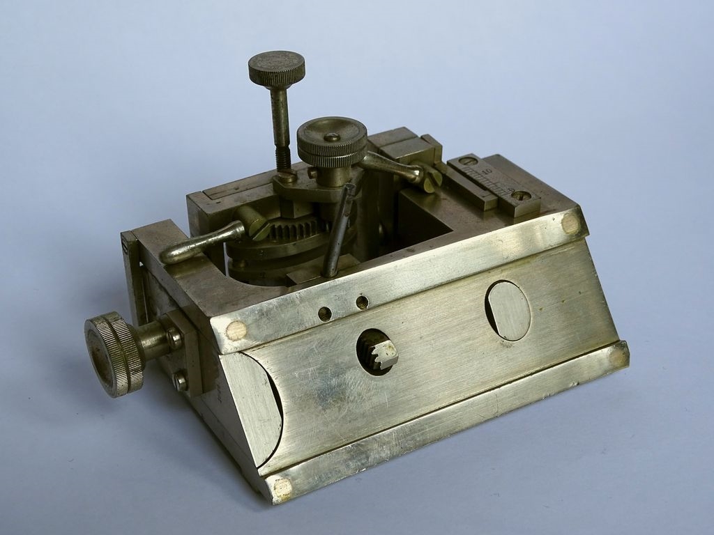 mir ist ein altes Schlittenmikrotom der Firma Jung (Heidelberg, Nr. 1644) zugeflogen. Das Gerät ist überraschend klein, so dass ich beim Auspacken für einen Moment beinahe enttäuscht war. Bei nähere Betrachtung wurde ich jedoch durch die unglaublich präzise gefertigte Mechanik mehr als entschädigt.