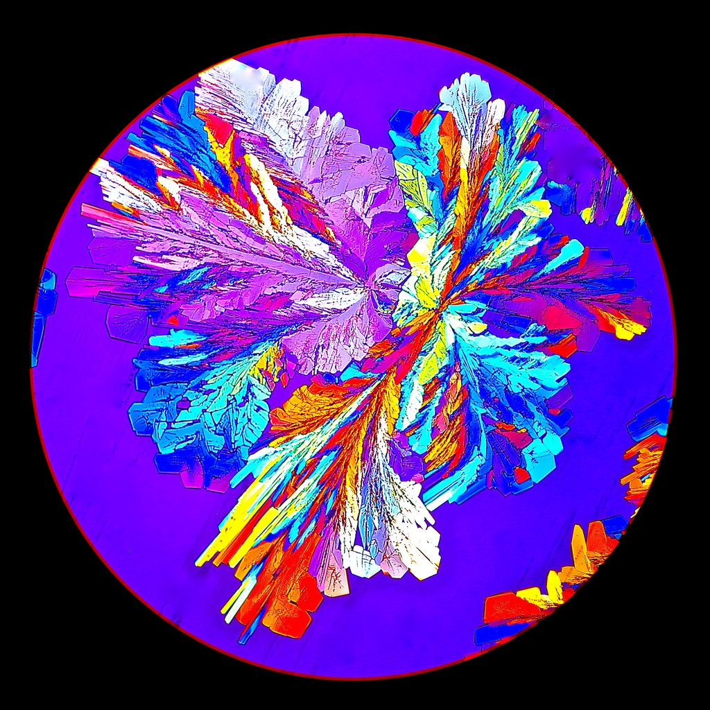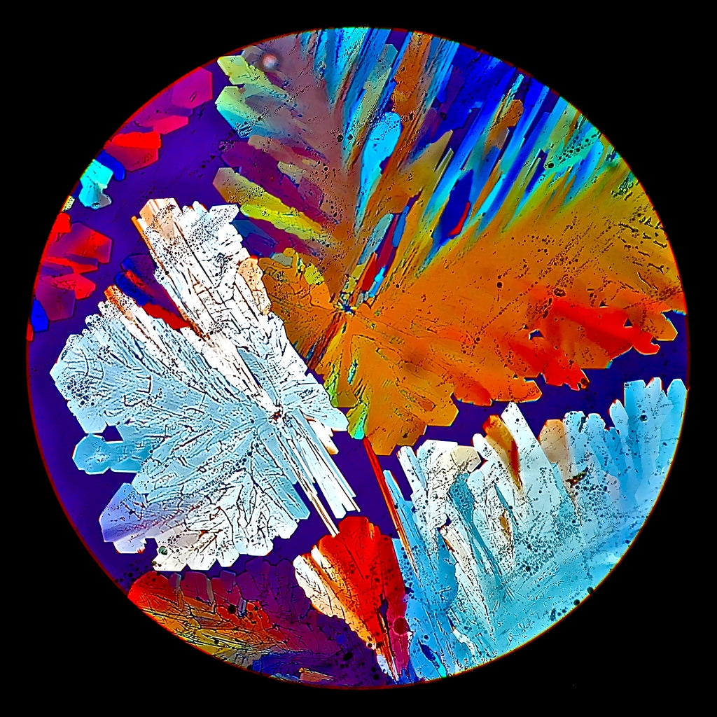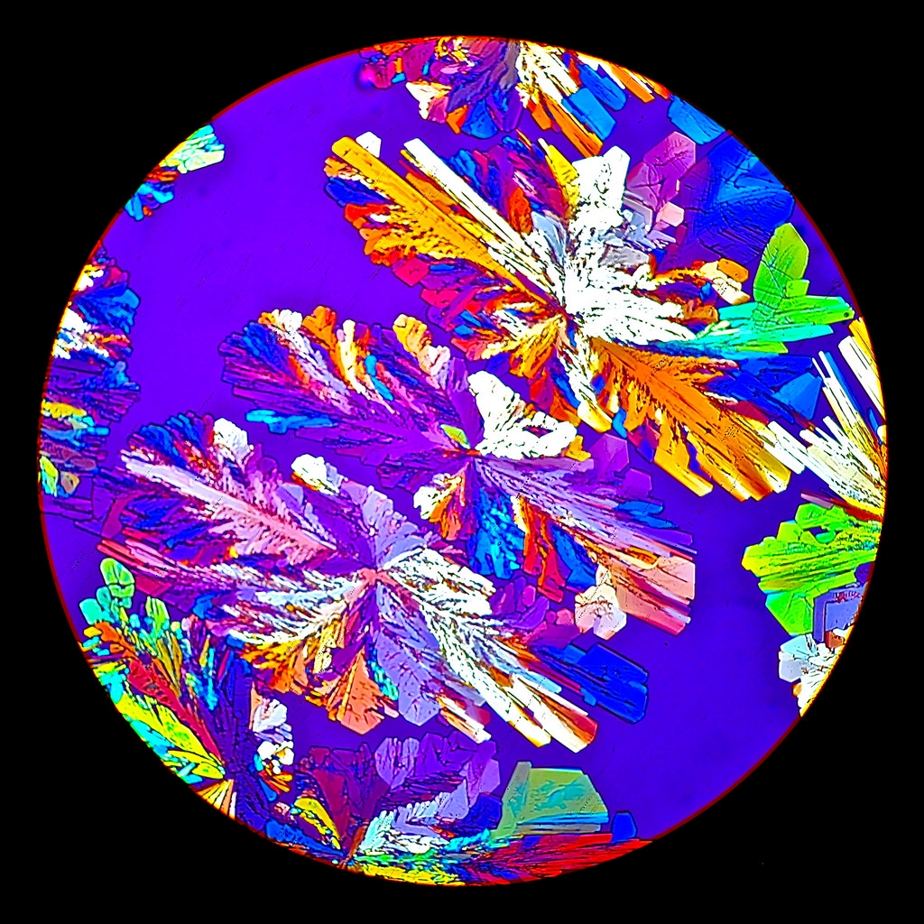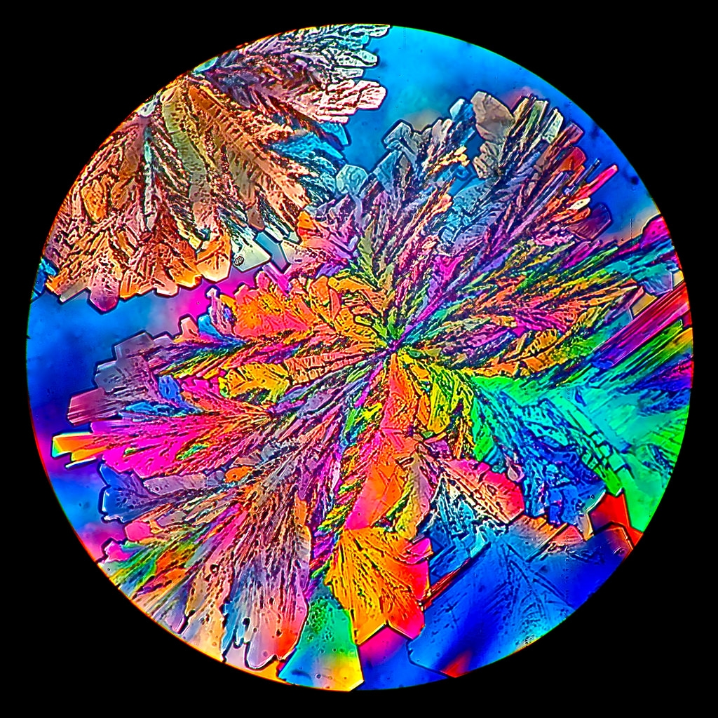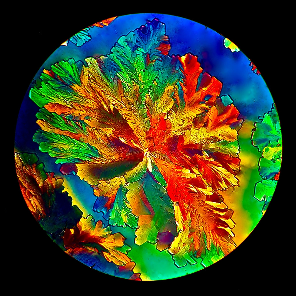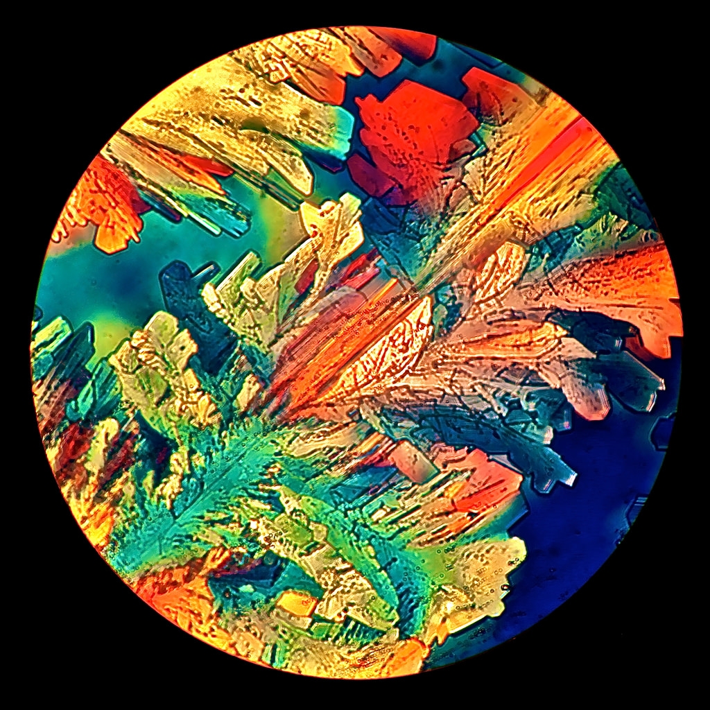Ich habe heute nach längerer Standzeit das Verdunstungspräparat erneut mikroskopiert. Die Kristallformen haben sich auch hier, wie beim Schmelzpräparat, weiter verändert, sie sind flächiger geworden. Nachstehend zeige ich 6 Bilder davon mit Spiegelreflexmikroskopie.