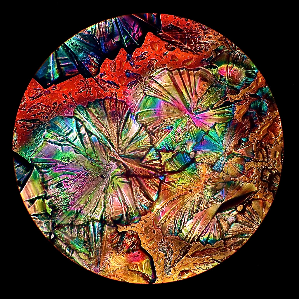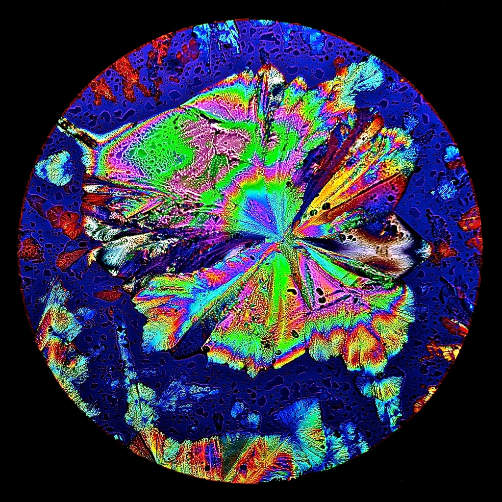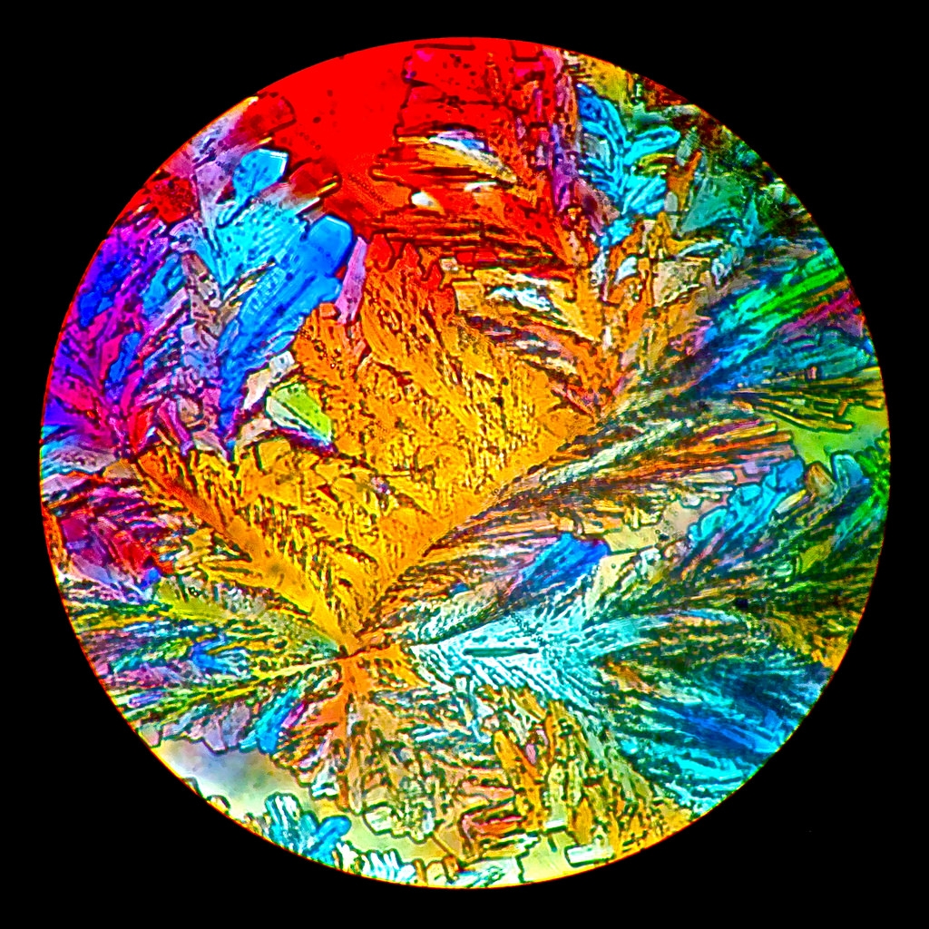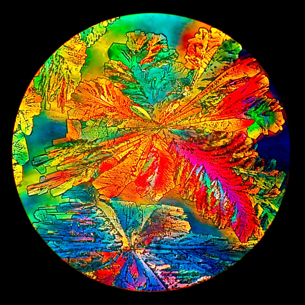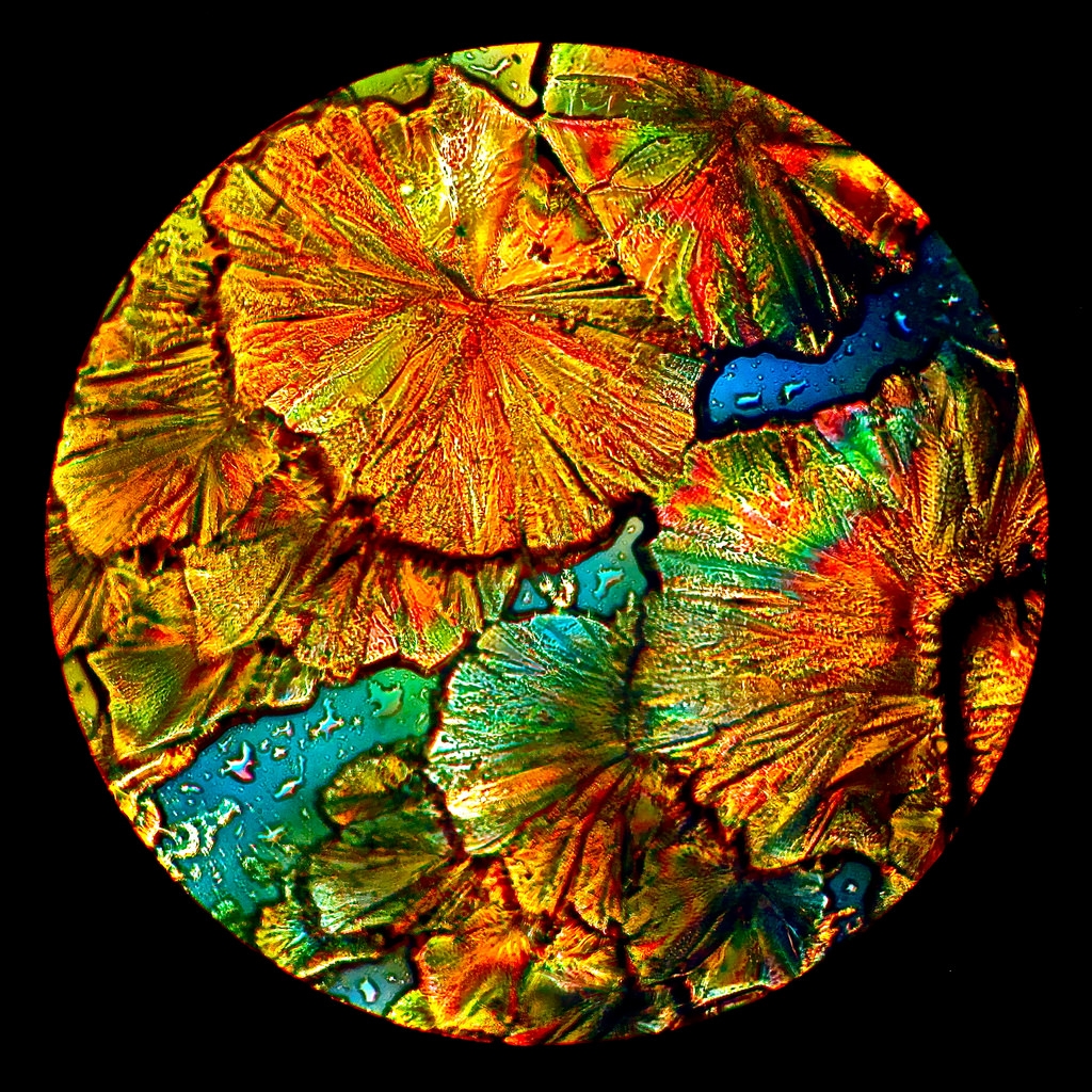 Ich habe heute nach längerer Standzeit das Verdunstungspräparat erneut mikroskopiert. Die Kristallformen haben sich auch hier, wie beim Schmelzpräparat, weiter verändert, sie sind flächiger geworden. Nachstehend zeige ich 6 Bilder davon mit Spiegelreflexmikroskopie.