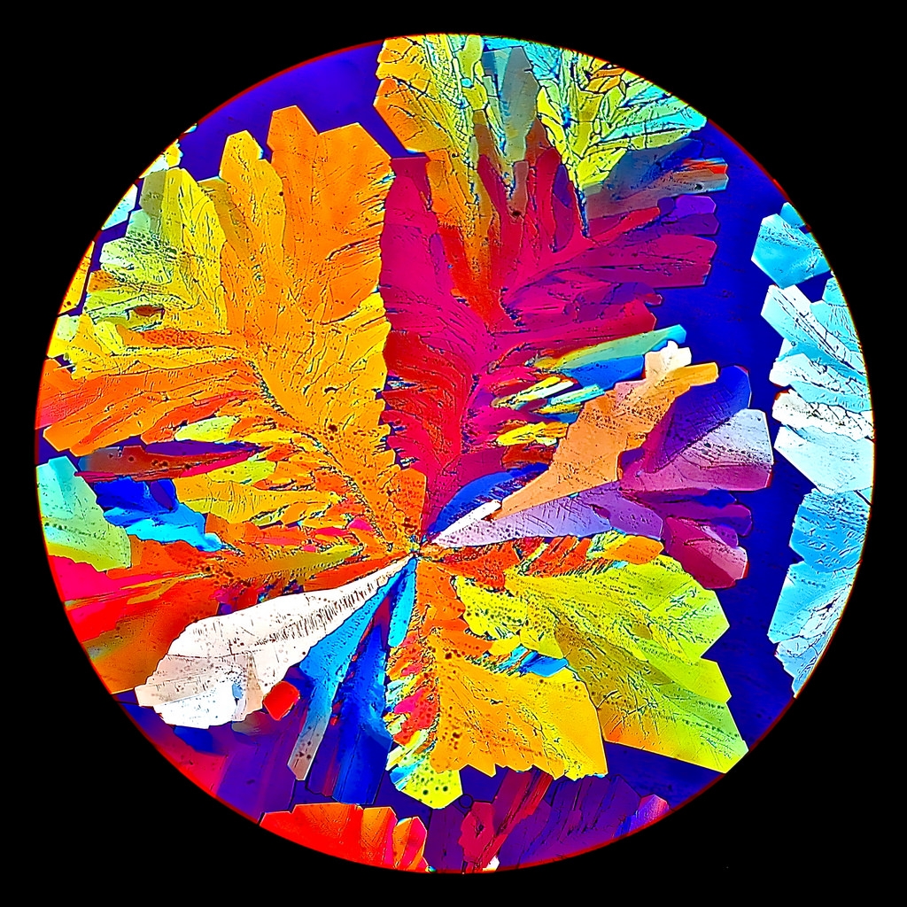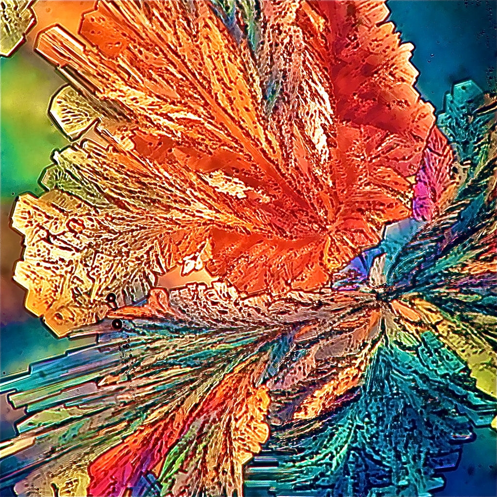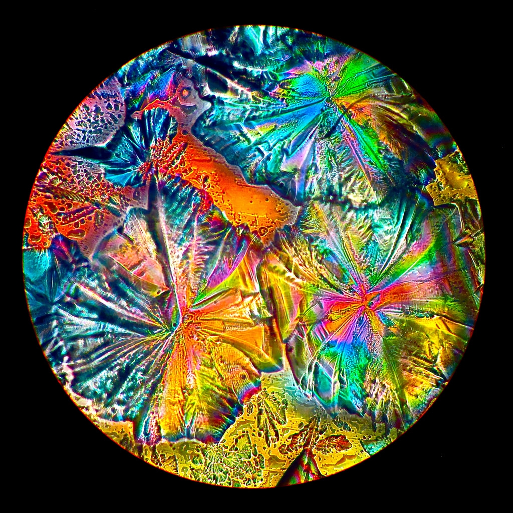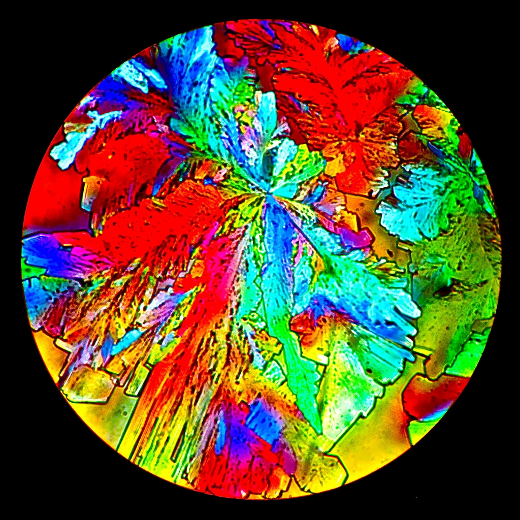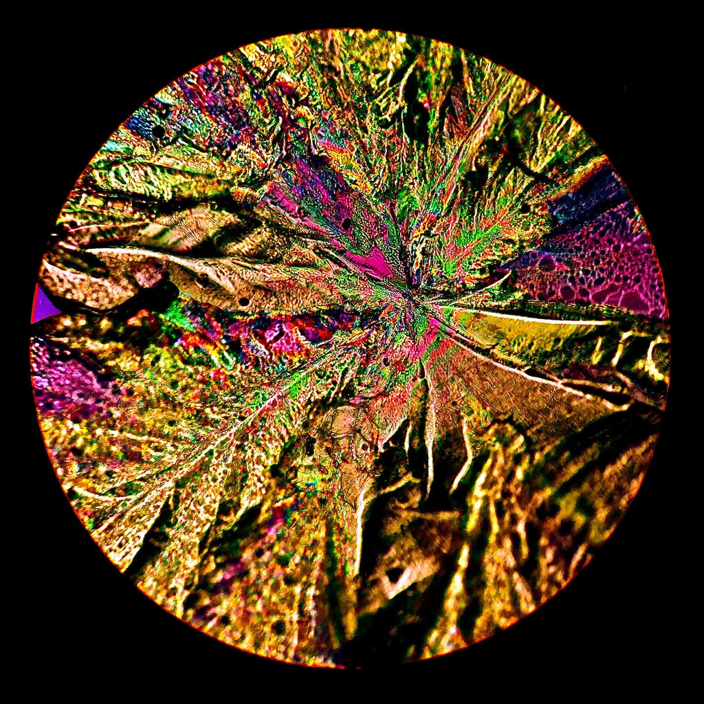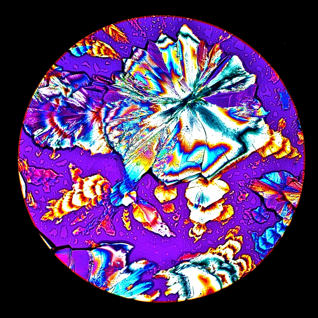 Ich habe heute nach längerer Standzeit das Verdunstungspräparat erneut mikroskopiert. Die Kristallformen haben sich auch hier, wie beim Schmelzpräparat, weiter verändert, sie sind flächiger geworden. Nachstehend zeige ich 6 Bilder davon mit Spiegelreflexmikroskopie.