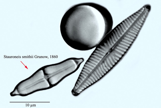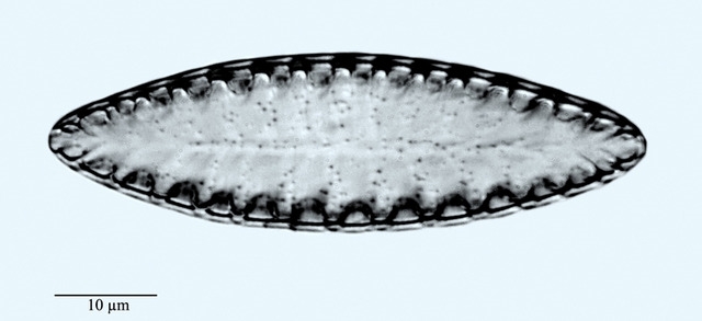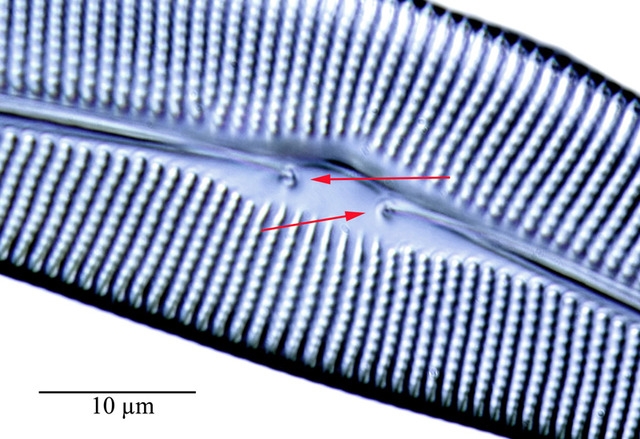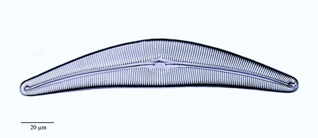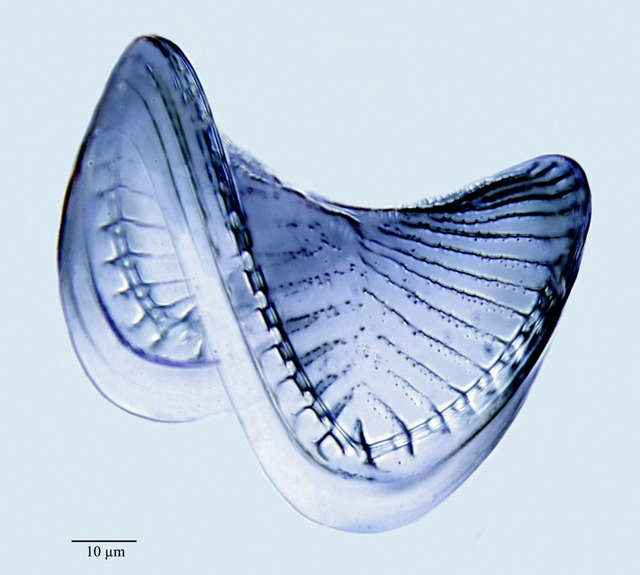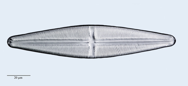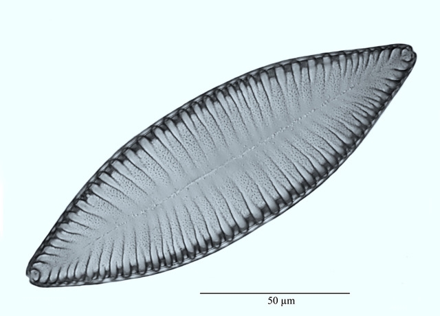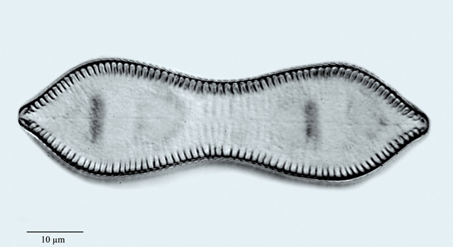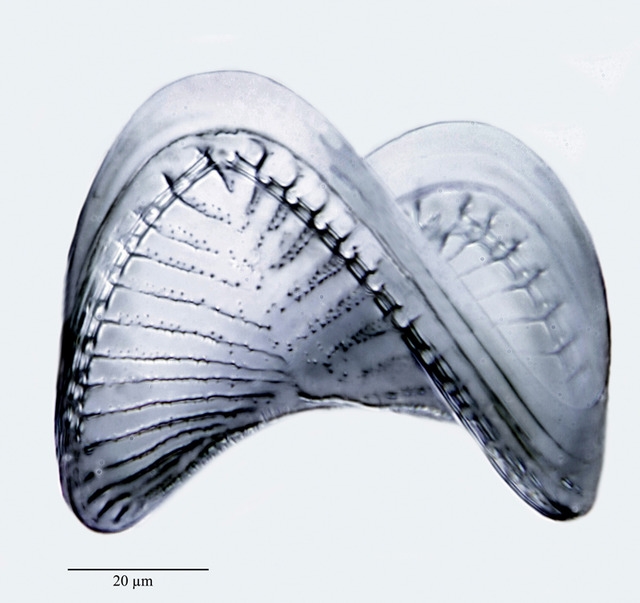 (Sieht aus wie ein und die selbe Diatomee in unterschiedlicher Lage, nur am Maßstab erkennbar, zwei Diatomeen unterschiedlicher Größe.)