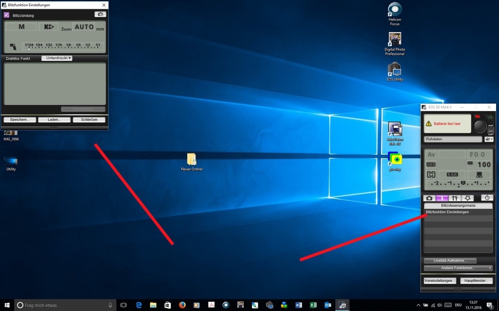 Bei den EOS utilities ist wohl keine Blitzbedienung vorgesehen, zumindest nicht bei der alten Version auf meinem PC. Notfalls könnte man aber zur Feinjustierung die Empfindlichkeit variieren, wenn man da im unteren Bereich noch Rauschreserven hat.